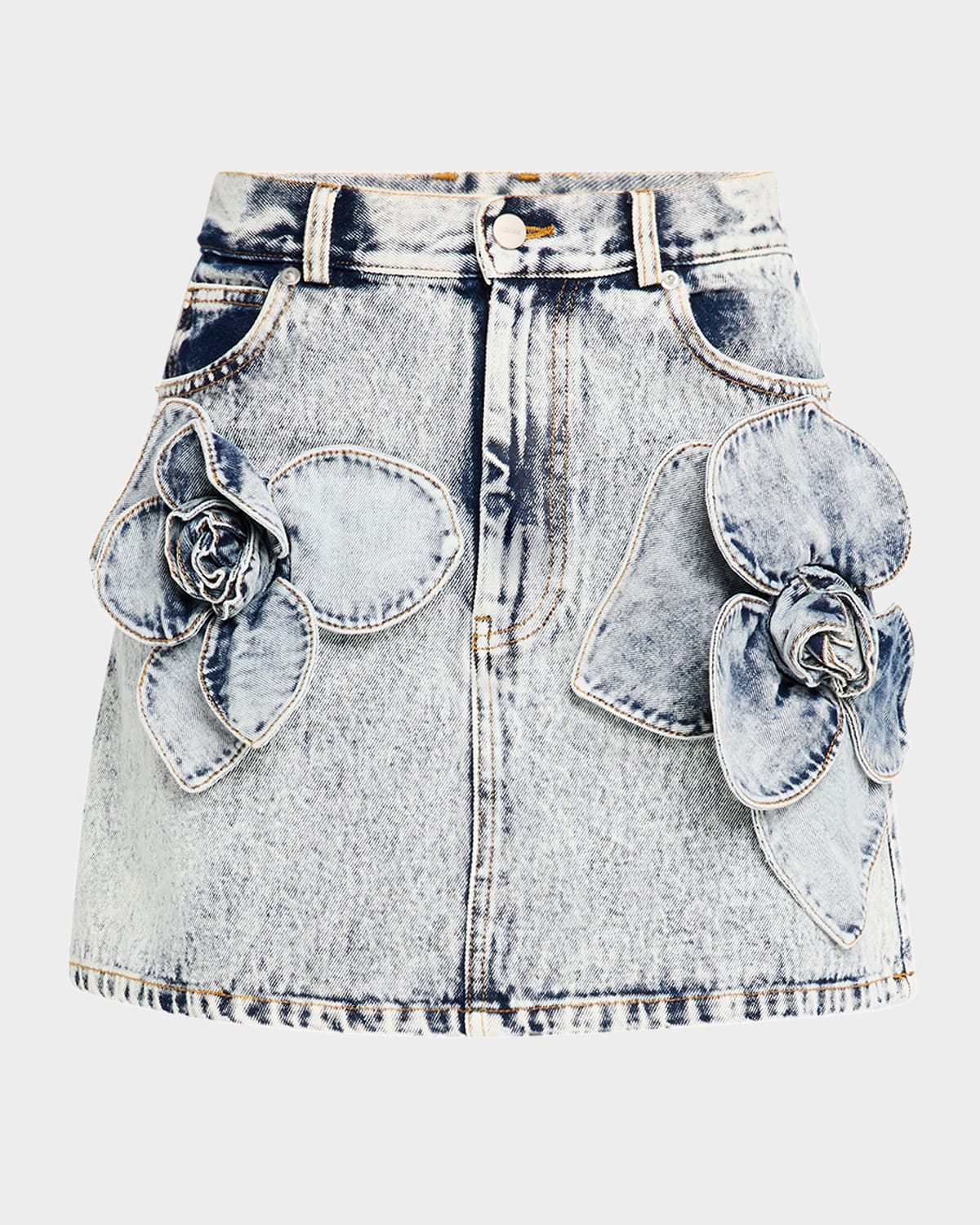 AKNVAS "Lucia" denim mini skirt featuring floral appliqué High rise Fivepocket style Skirt falls straight from hip to hem Hem falls above the knee Button/zip fly; belt loops Cotton Lining: Cotton/polyester Dry clean Imported