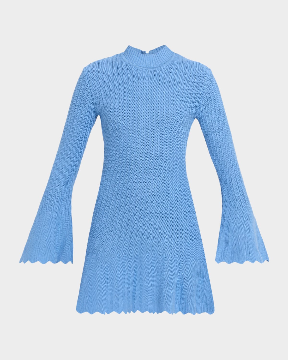 Knitted from a textural chevron design, the "Maja" dress by AKNVAS is finished with unique zigzag trim Ribbed mock neckline Long flare sleeve; approx. 24"L Hem falls above the knee Fitandflare silhouette Invisible back zipper Cotton Unlined Dry clean Imported
