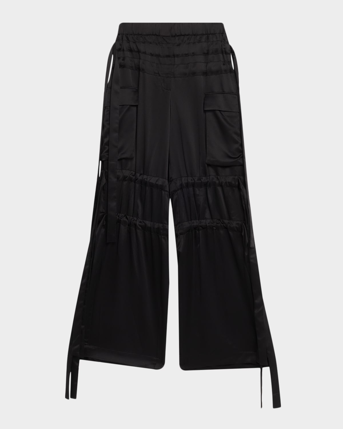 A statementmaking cargo silhouette, the "Odin" parachute pants by AKNVAS feature legcinching satin ties for versatile styling Midrise sits high on hip Side cargo pockets Full length Wide legs Hidden hook/zip fly Polyester Lining: Polyester Dry clean Imported