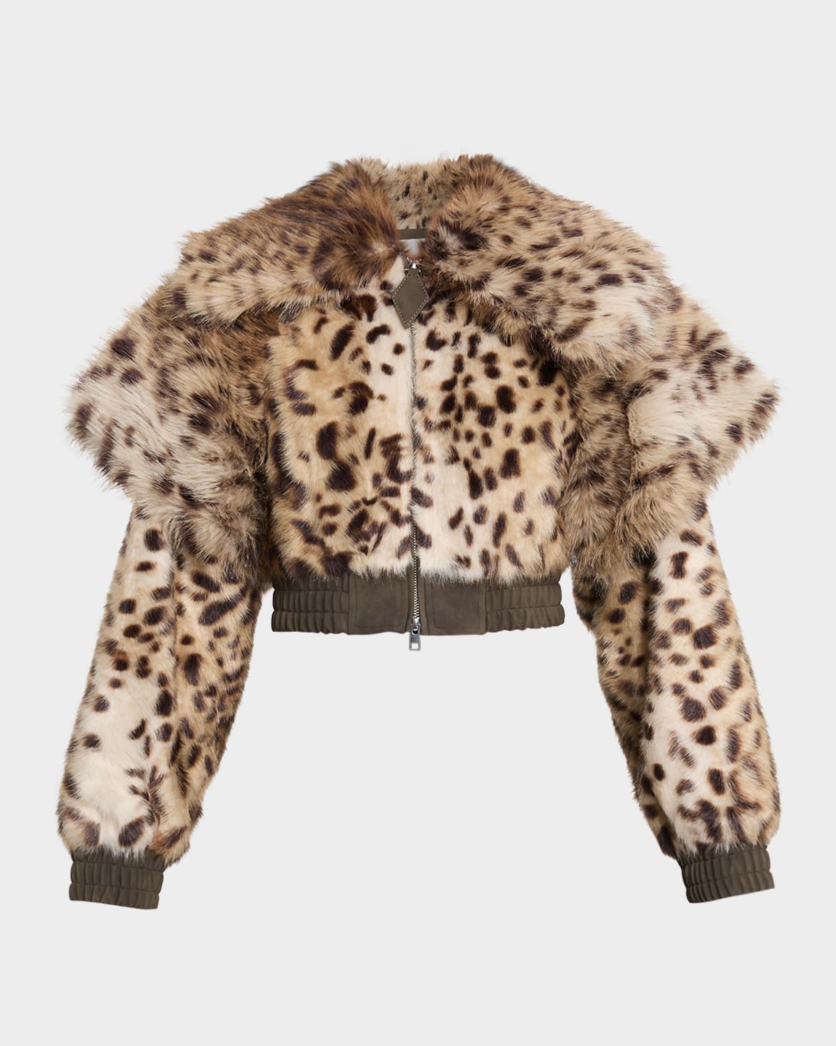 Composed of plush faux fur (modacrylic/polyester), the "Valde" bomber jacket by AKNVAS is artificially dyed to mimic the spots of a lynx Oversized spread collar Long sleeves; approx. 32"L Faux leather (polyester) elasticated cuffs and hem Cropped length Twoway front zipper closure Polyester Lining: Polyester Do not iron, dry clean Imported