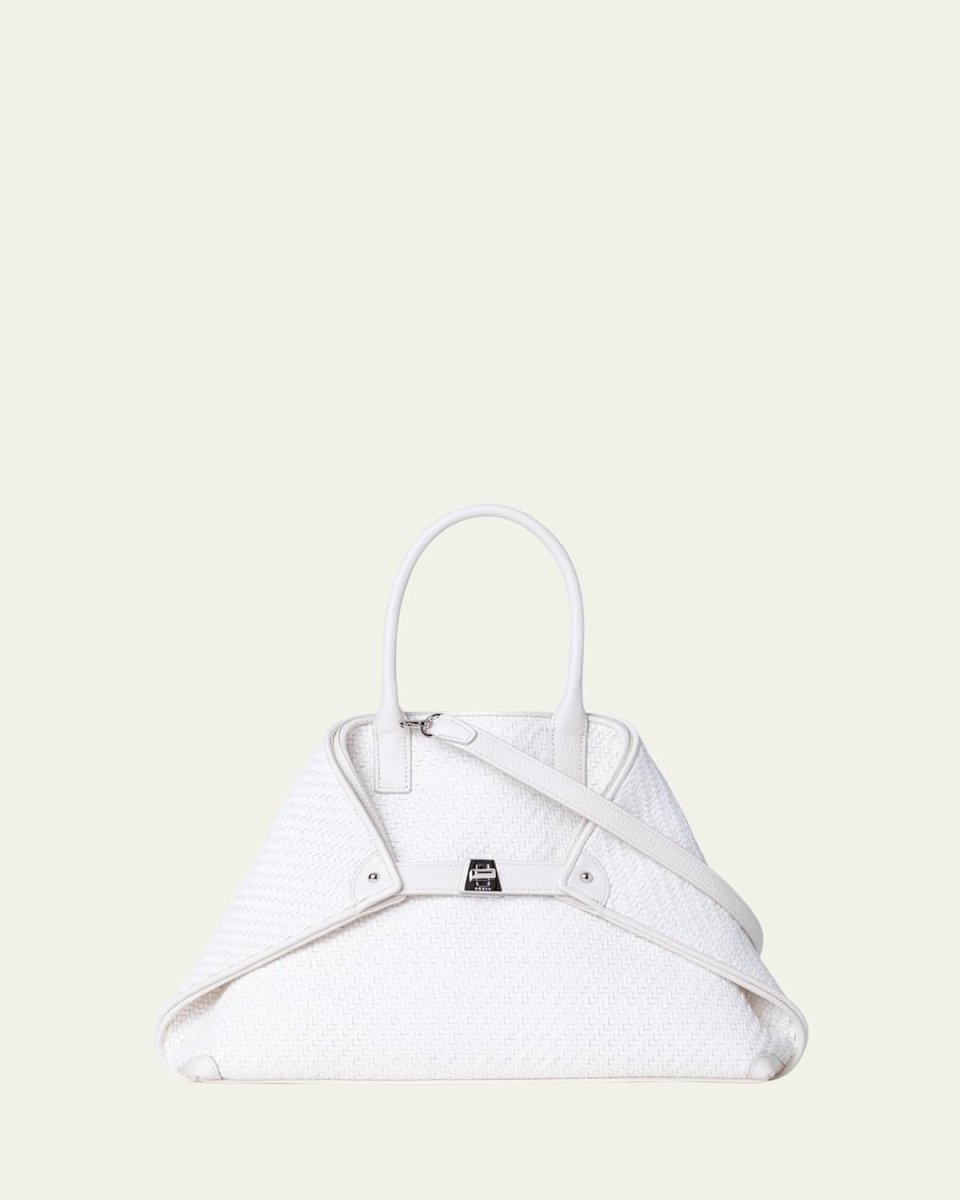 Akris "Ai" top handle bag in braided leather Rolled top handles Shoulder strap Can be worn as a top handle or shoulder bag Open top with magnetic closure; center turnlock strap Interior, one zip pocket Feet protect bottom of bag Approx. 7.5"H x 13"W x 2"D Made in Romania