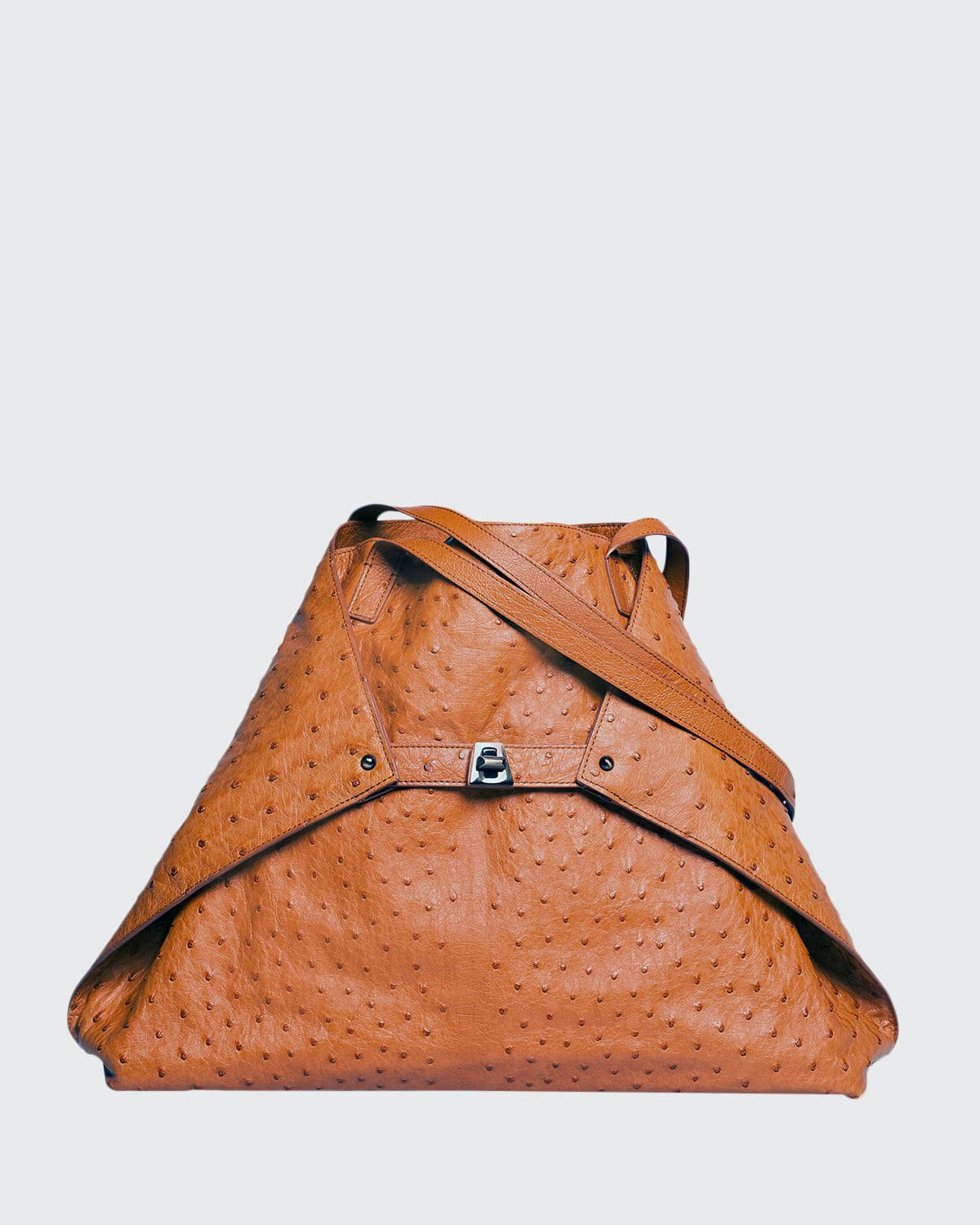 Akris "Ai" tote bag in fullquill ostrich with silvertone hardware. Flat shoulder straps. Turnlock strap gathers in sides. Shopper silhouette converts to trapezoid. Inside, zip, slip, and cell phone pockets. Fabric lining; metal feet protect bag bottom. 12"H x 18"W x 5"D. Made in Romania.