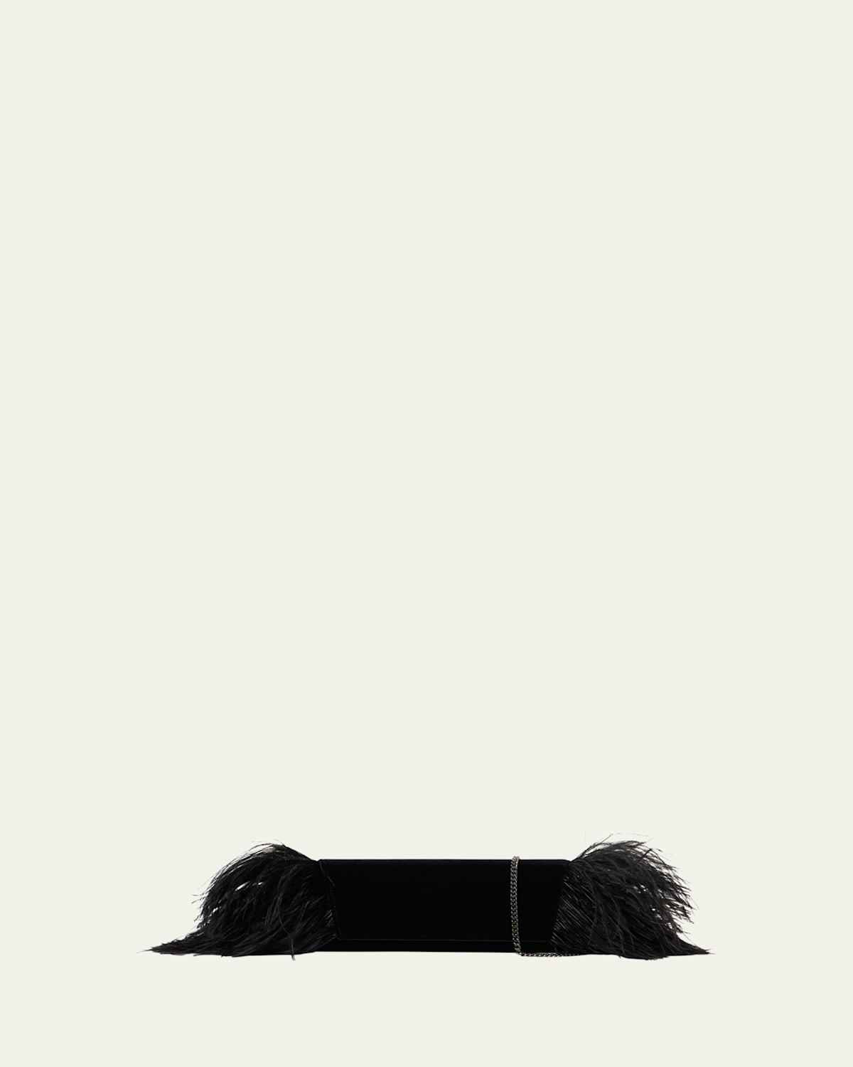 Akris "Anouk" trapezoid clutch bag with tonal ostrich feather trim Detachable chain shoulder strap Can be worn as a clutch or shoulder bag Envelope flap top with magnetic closure Center zip compartment divides interior Approx. 4.5"H x 11.6"W x 2.1"D Polyester/leather Spot clean Made in Romania