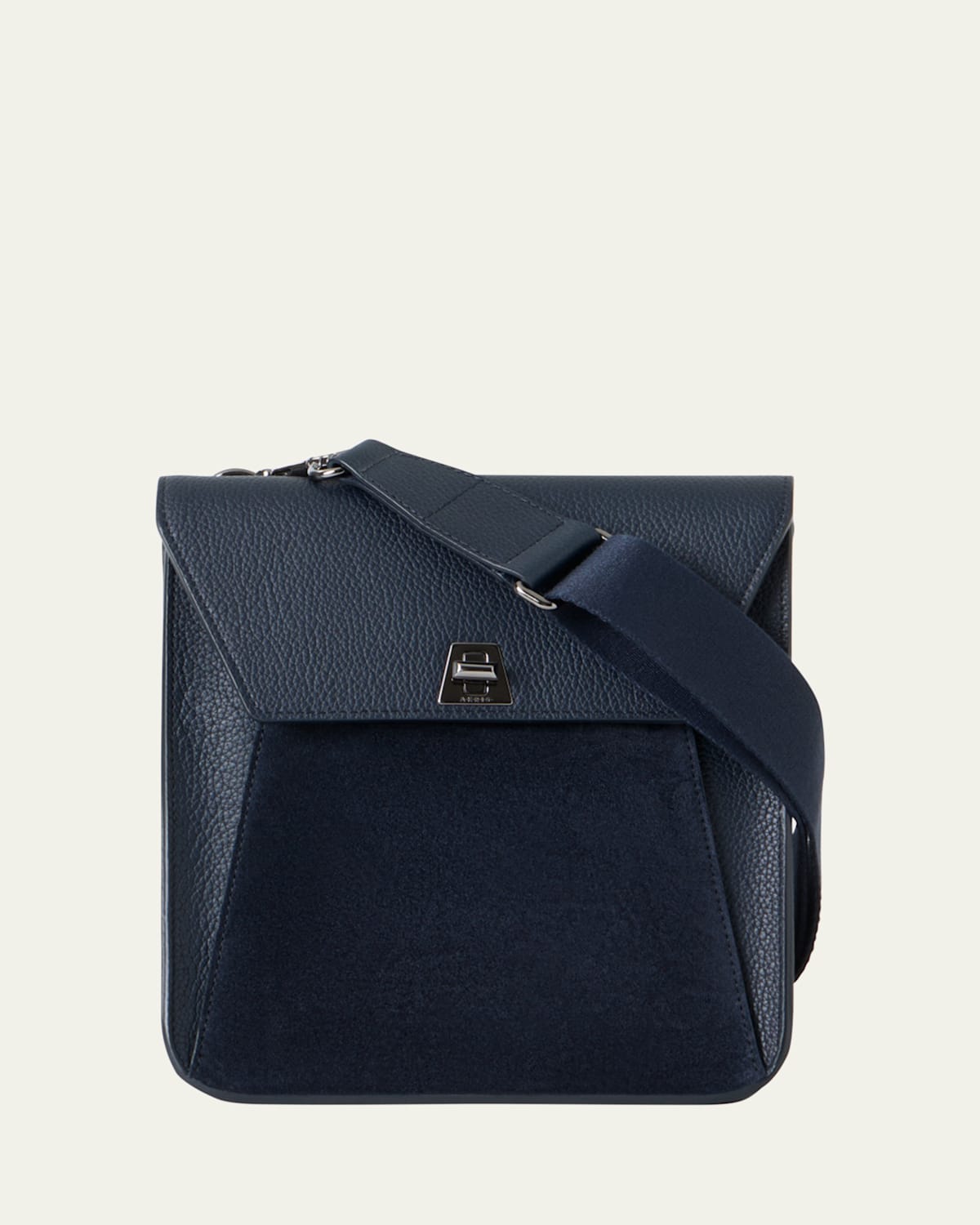 Akris "Anouk" small messenger crossbody bag in grain leather with suede signature trapezoid front Detachable, adjustable crossbody strap Flap top with turn lock closure Exterior, one slip pocket Interior, one slip pocket Approx. 9"H x 7.6"W x 2.3"D Made in Romania