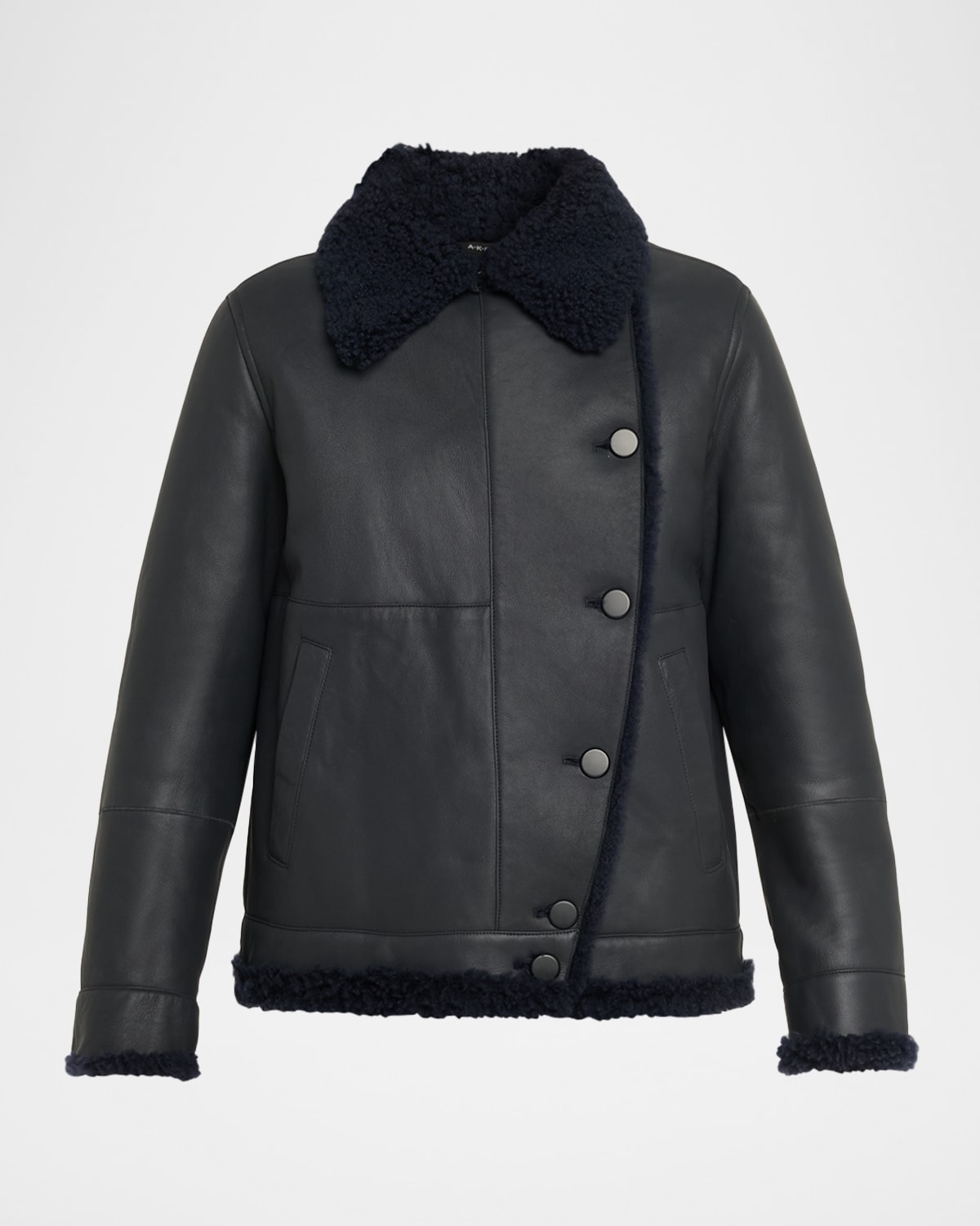 Akris "Arno" jacket is crafted of warm dyed merinillo curly lamb shearling (Turkey) Point collar; offcenter singlebreasted front Long sleeves; button cuffs Hip welt pockets Boxy fit Hip length Shearling Dry clean Made in Romania