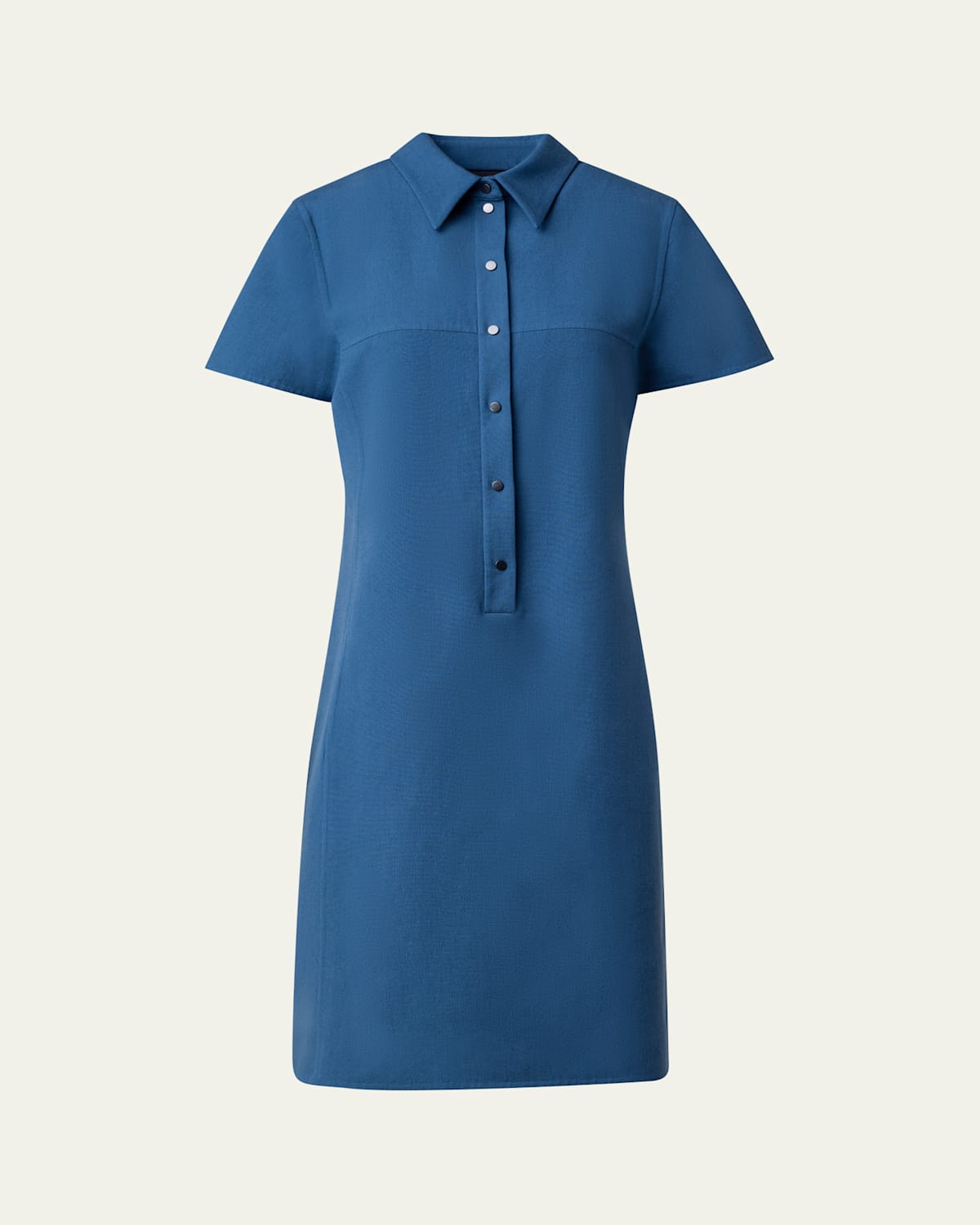 Akris short polo dress in a cotton and silk doubleface stretch finish Shirt collar Metal press buttons at the front Short sleeves Side slip pockets Hem falls below the knee Aline silhouette Cotton/silk/elastane Made in Switzerland