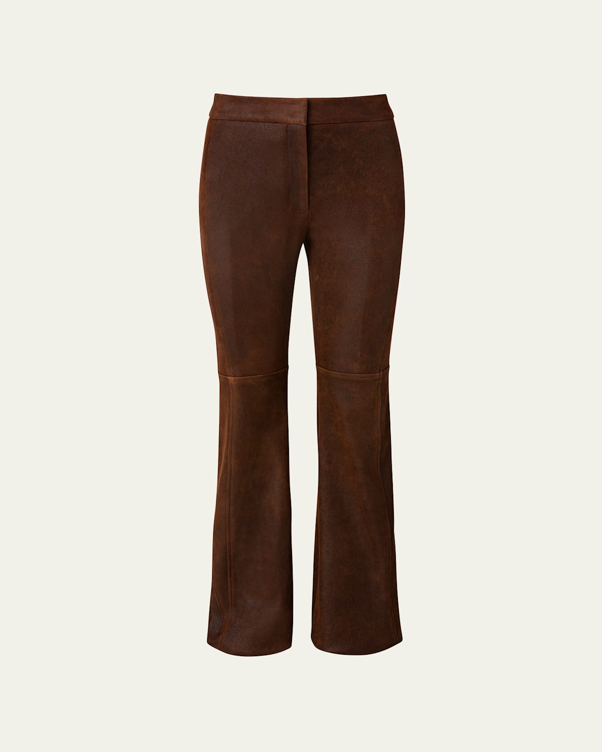 Akris "Faris" techno neoprene pants High rise Flat front Fitted through hip and thigh; bootcut opening Full length Hook/zip fly Lambskin leather Dry clean Made in Romania