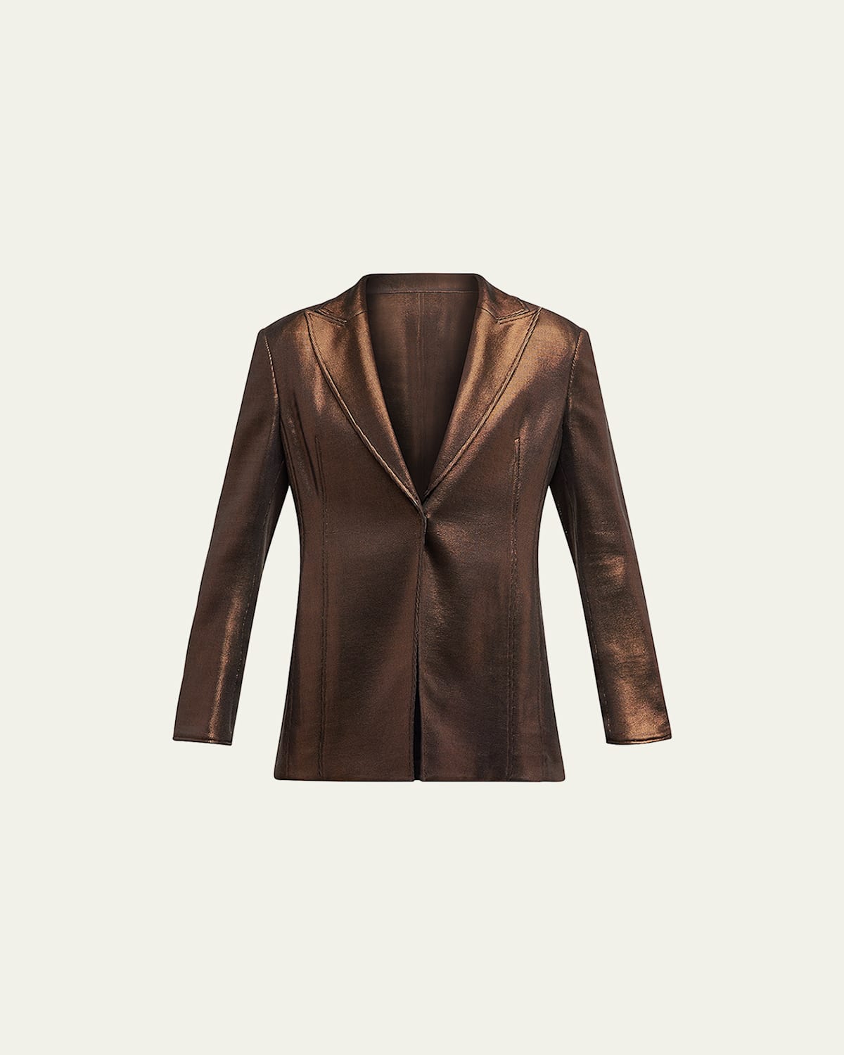 Akris "Malina" blazer jacket with a viscose liquid jersey finish Peak lapel collar Snap closure Long sleeves Side seam pockets Semifitted Center back slit Virgin wool/nylon/elastane Lining: Viscose Dry clean Made in Romania