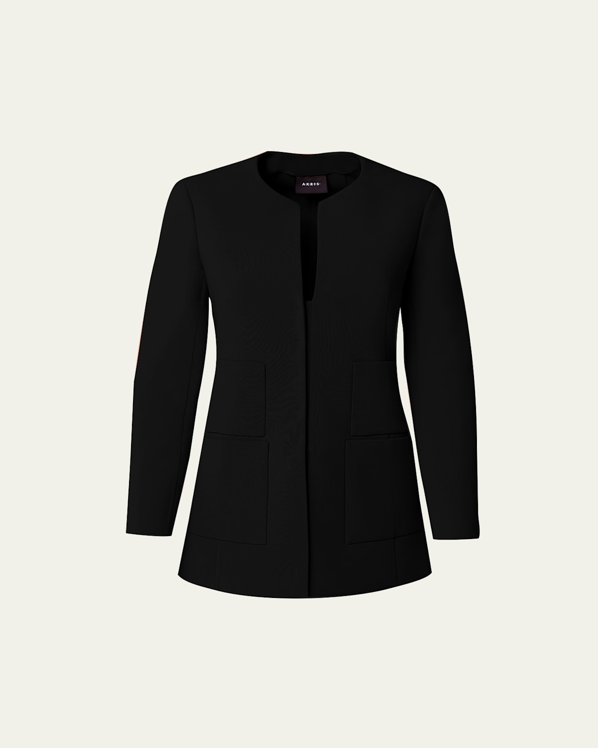 Akris "Milena" doubleface wool jacket with hook and eye closure at front Approx. 28"L from shoulder to hem Round neckline Long sleeves Front patch pockets Fitted Wool/elastane Lining: Cupro Dry clean Made in Switzerland