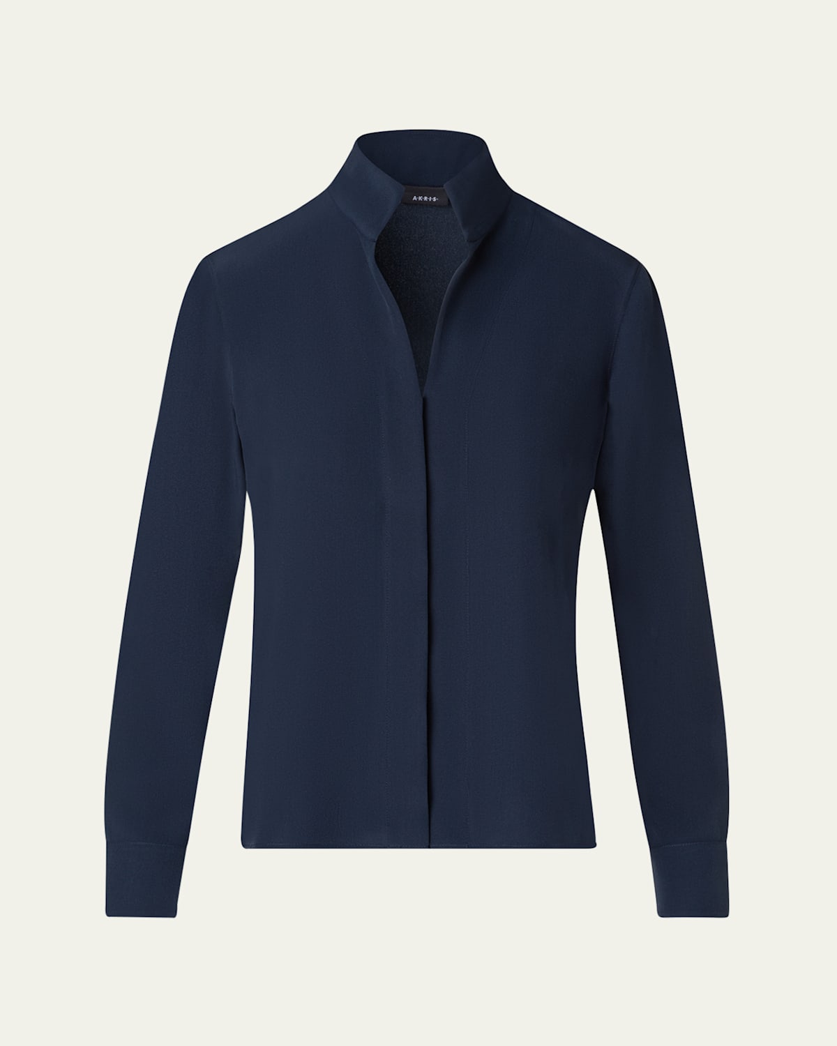 Akris silk crepe blouse mock neck, covered button panel, long sleeves Mock neckline; concealed button panel Long sleeves; button cuffs Straight fit Silk Made in Romania