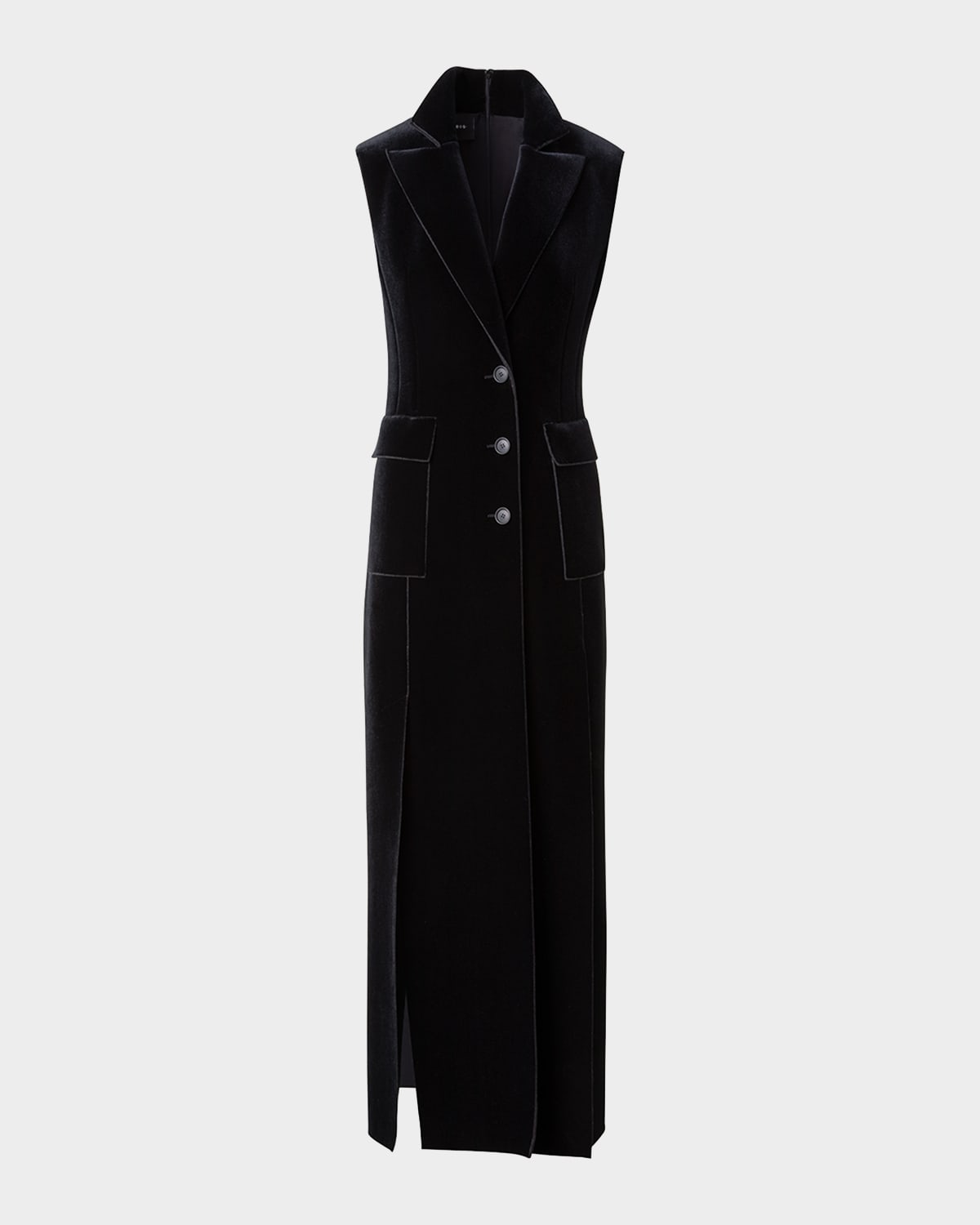Akris tuxedo gown in an allover neoprene velvet finish Notched lapel collar Button closure Sleeveless Side flap pockets Full length Aline silhouette Polyester/nylon/polyamide Dry clean Made in Switzerland