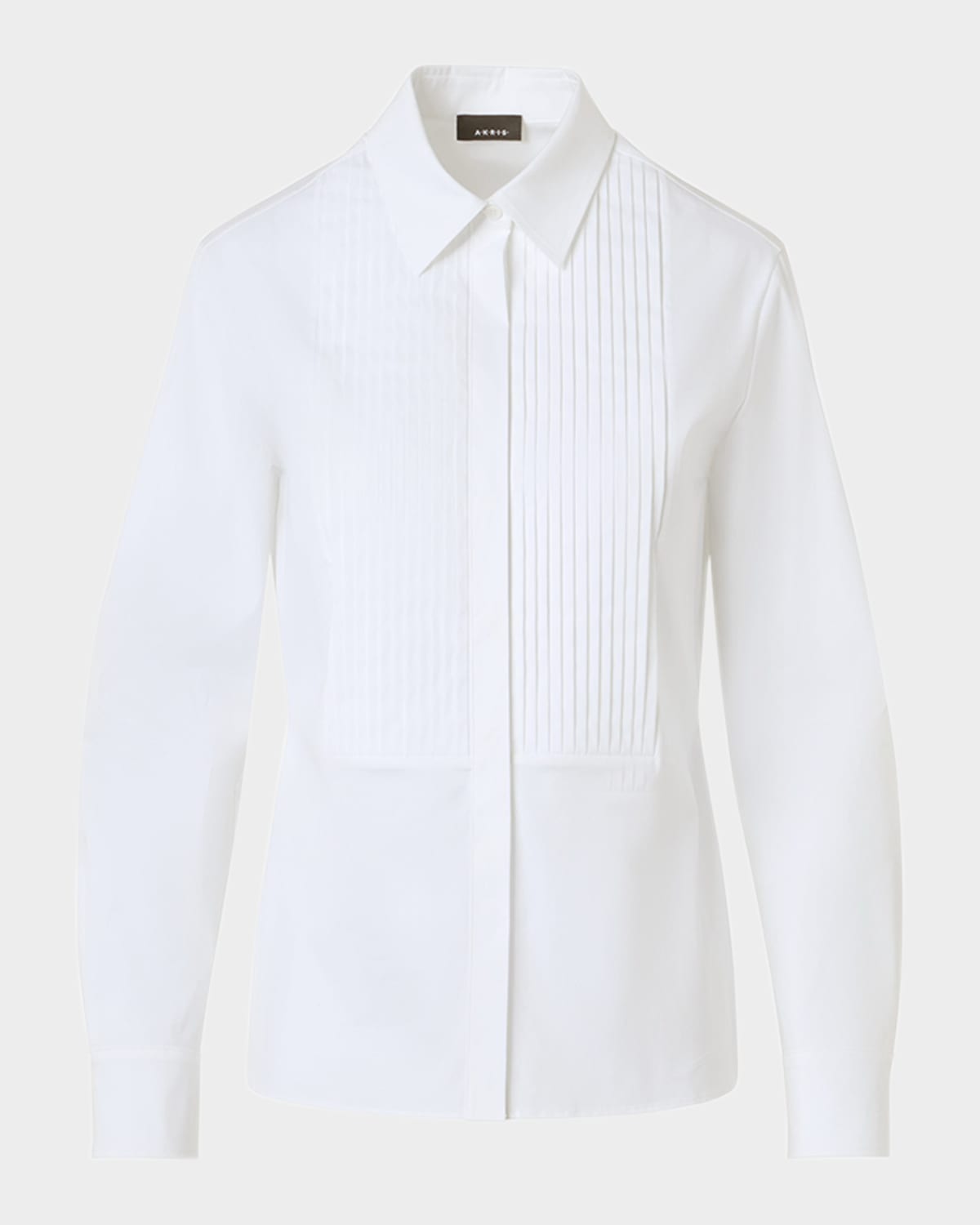 Akris crisp shirt embodies timeless elegance with a pleated bib front and barrel button cuffs Point collar Long sleeves Yoked back Back tailored with darts Hip length Slim fit Cotton/nylon/polyamide/elastane Made in Romania
