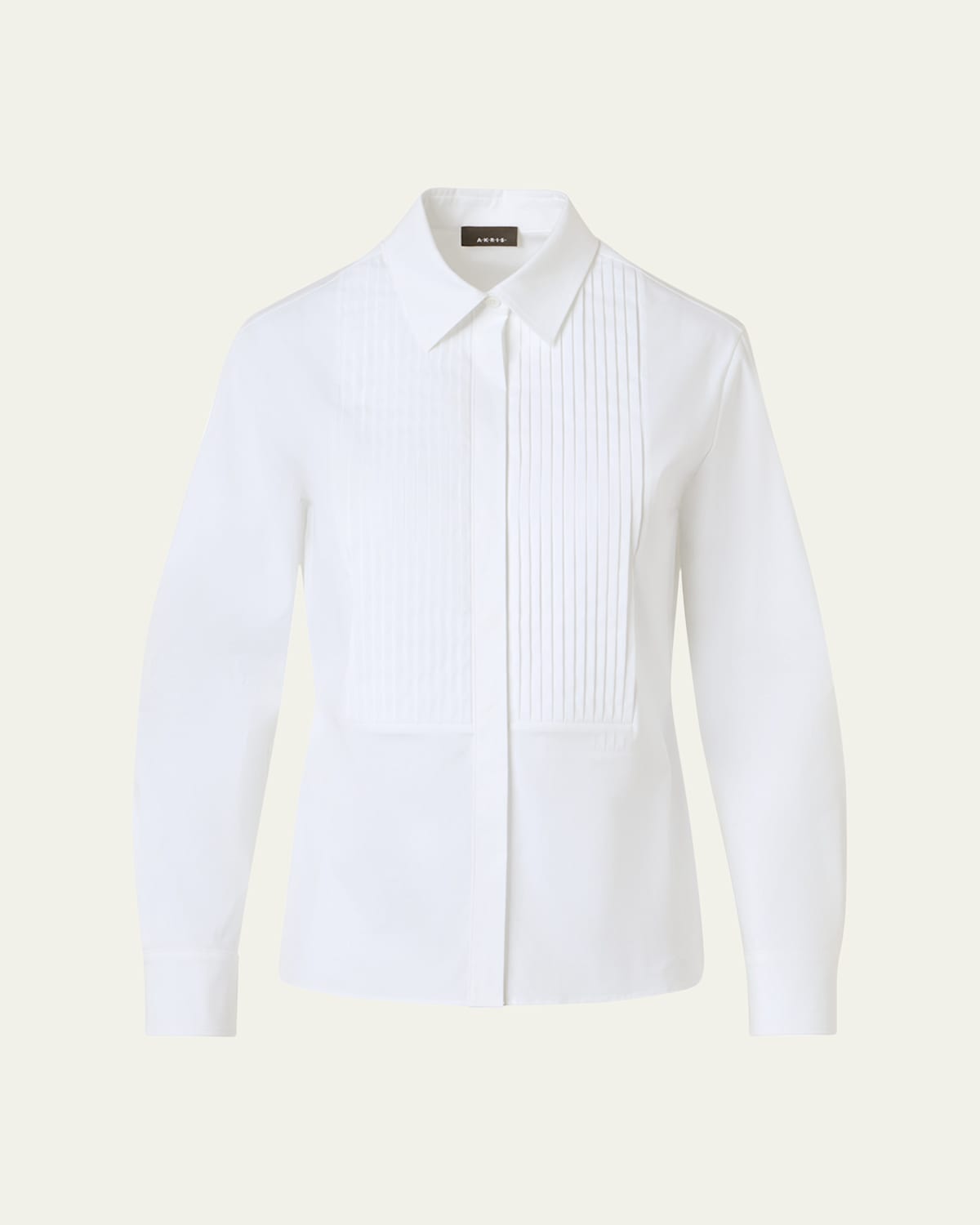 Akris crisp shirt embodies timeless elegance with a pleated bib front and barrel button cuffs Point collar Long sleeves Yoked back Back tailored with darts Hip length Slim fit Cotton/nylon/polyamide/elastane Made in Romania