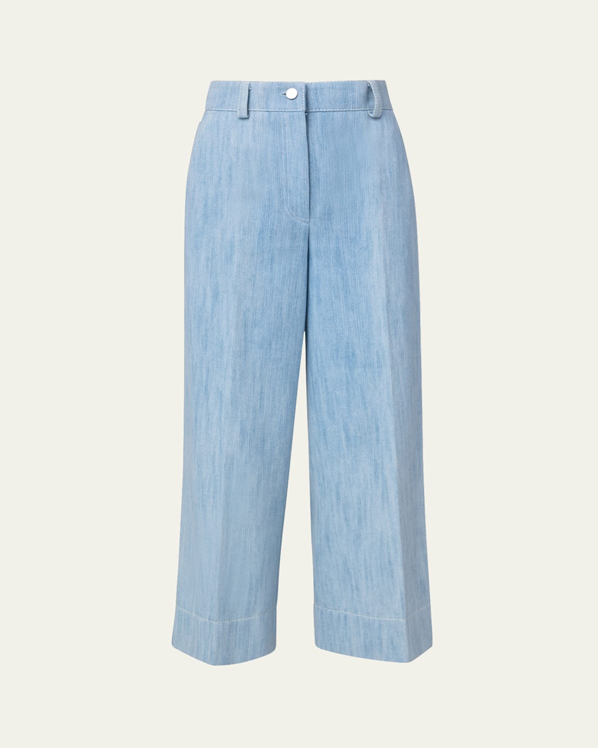 Akris punto "Chiara" cotton denim pants with a dotted detail at the back pocket High waist Flat front Button/zip fly; belt loops Side slip pockets; back patch pockets Wide legs Cropped at the ankle Cotton/spandex Lining: Cupro Made in Romania