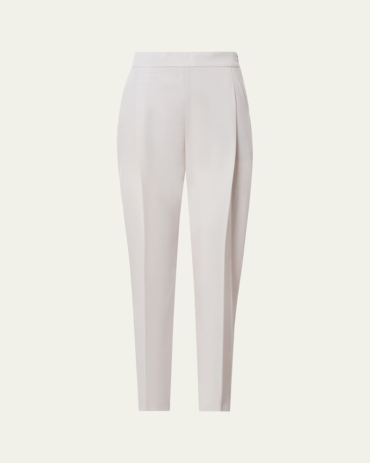 Akris punto "Fiola" stretcg pants with big front pleats Ankle length Mid rise sits high on hip Side slash pockets Slouchy legs Side zip Virgin wool Cupro lining Made in Romania