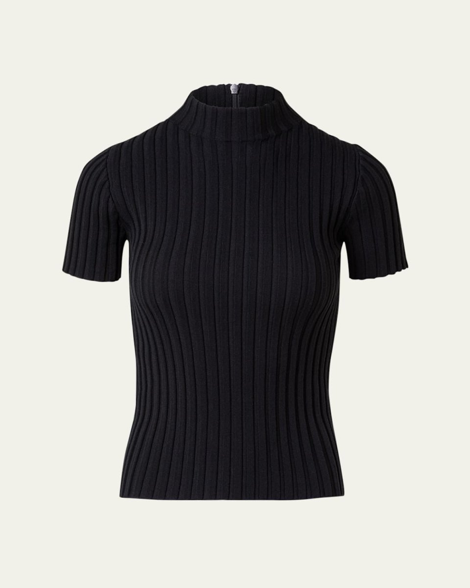 Akris punto merino wool ribbed knit top features back zip closure with a signature ring pull Mock neckline Short sleeves Hip length Fitted Wool Dry clean Imported