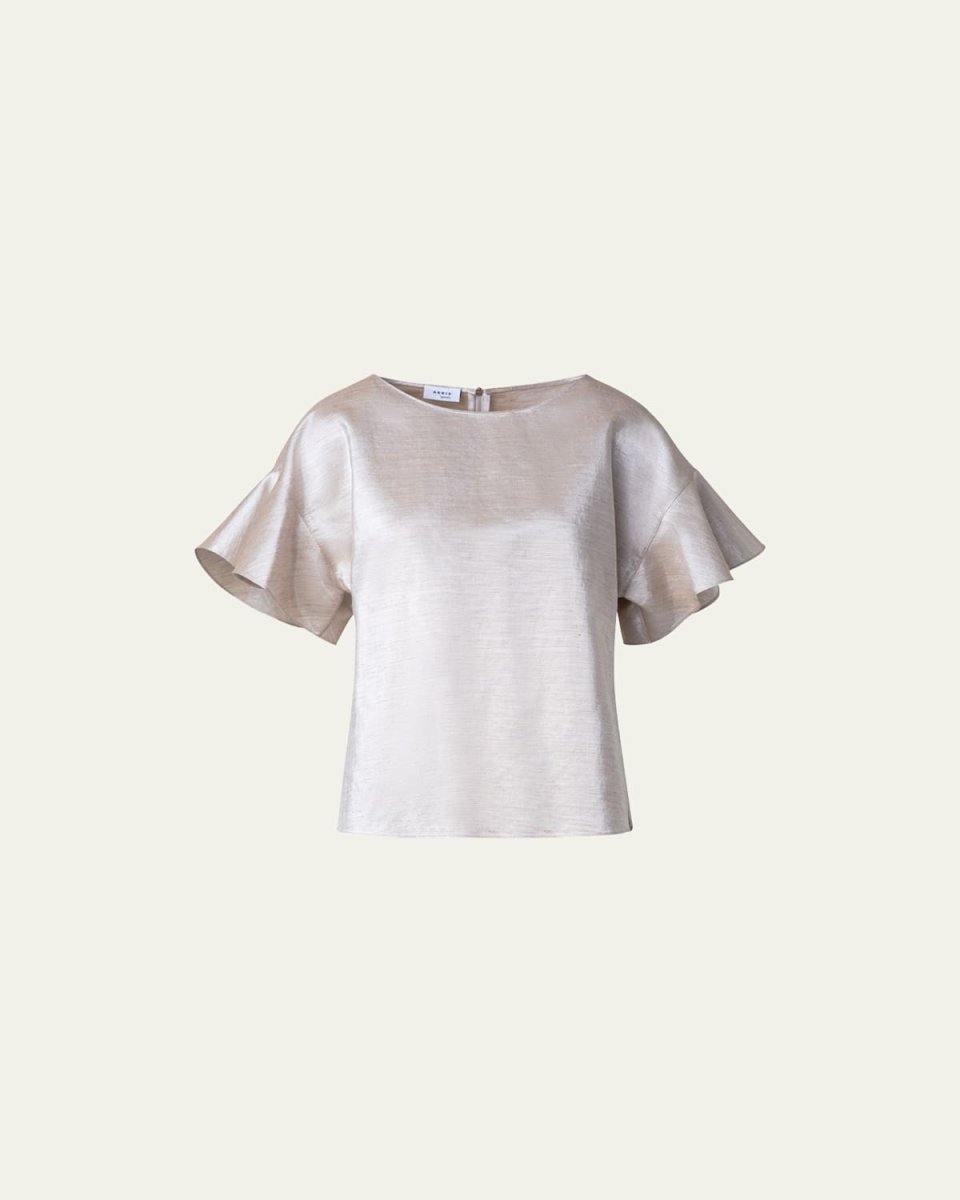 Akris punto blouse in a metallic cotton linen canvas finish Round neckline Short wing sleeves; dropped shoulders Side slits Back zip closure Hip length Relaxed fit Cotton/linen/metal Made in Romania