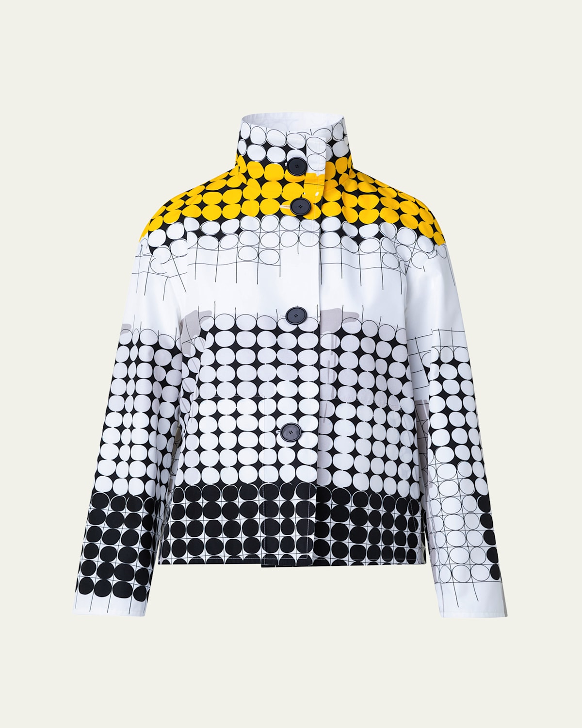 Akris punto techno taffeta short jacket in an allover facade skyscraper printed finish Stand collar Button front closure Long sleeves; dropped shoulders Side slip pockets Back box pleat Polyester Lining: Cupro Made in Romania