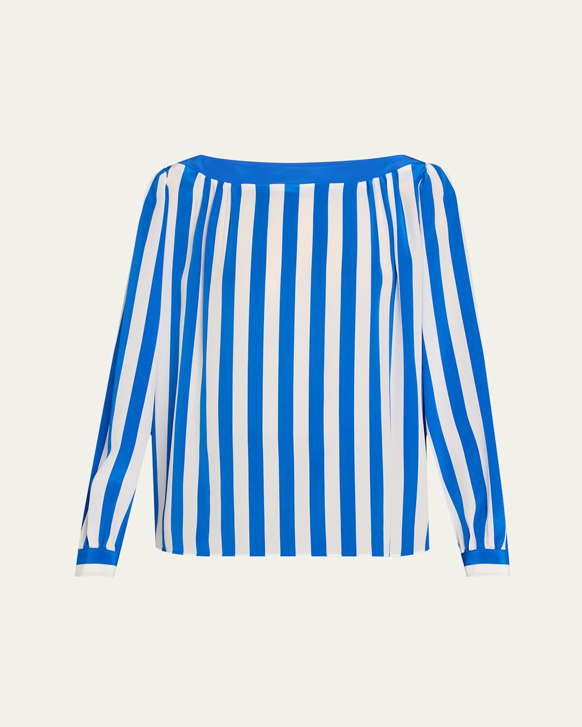 Akris punto silk blouse featuring a striped print High neckline Long sleeves; button cuffs Loose fit Pullover style Silk Dry clean Made in Romania
