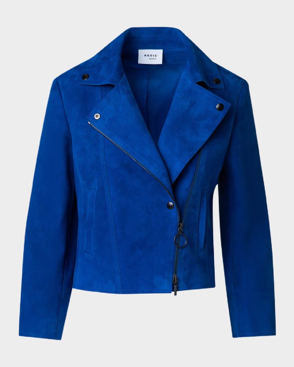 Akris punto goat suede biker jacket Notched collar; asymmetric zip front Long sleeves; slit cuffs Front welt pockets Fitted Dry clean Made in Romania