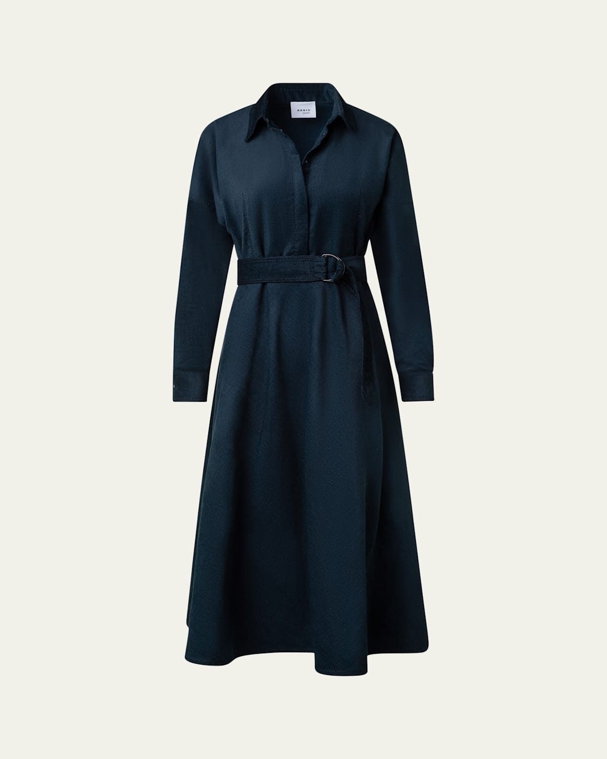 Akris punto washed fine corduroy dress with a Dring belt Kent collar; concealed quarter button placket Long sleeves; button cuffs Side slip pockets Dropped shoulders Midi length Aline silhouette Slipover style Cotton/viscose Dry clean Made in Romania