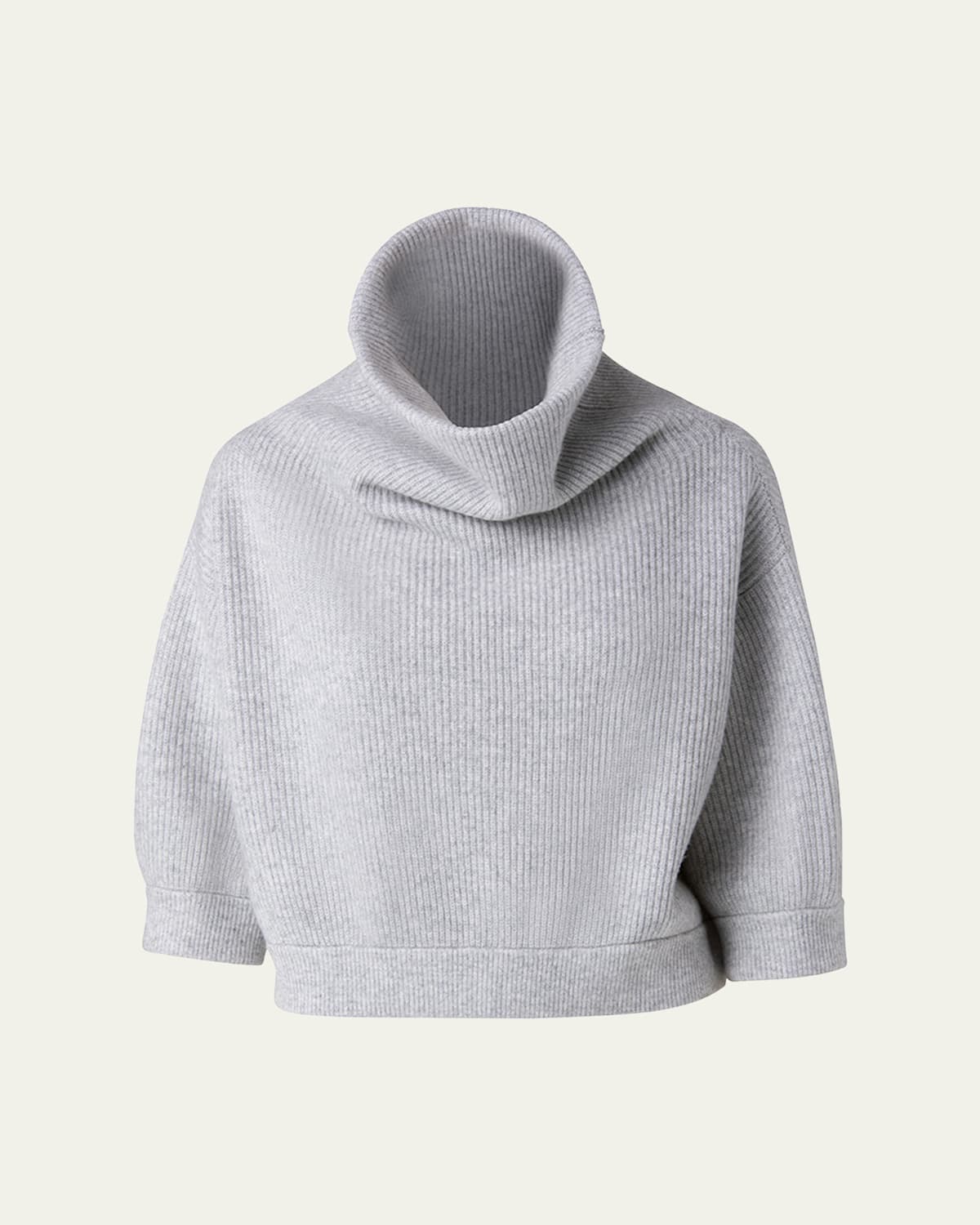 Akris ribknit cashmere sweater Approx. length: 20" from shoulder to hem Cowl neckline Dropped shoulders 3/4 sleeves Relaxed fit Ribbed cuffs and hem Pullover style Cashmere Dry clean Made in Romania