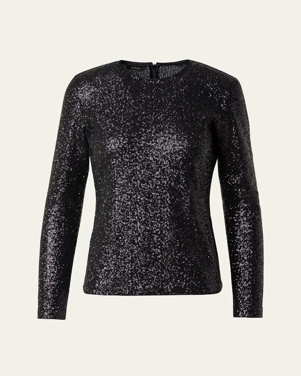 Akris jersey top in an allover sequin finish Round neckline Long sleeves Hip length Fitted Back zip closure Polyester/elastane Lining: Silk Dry clean Made in Romania