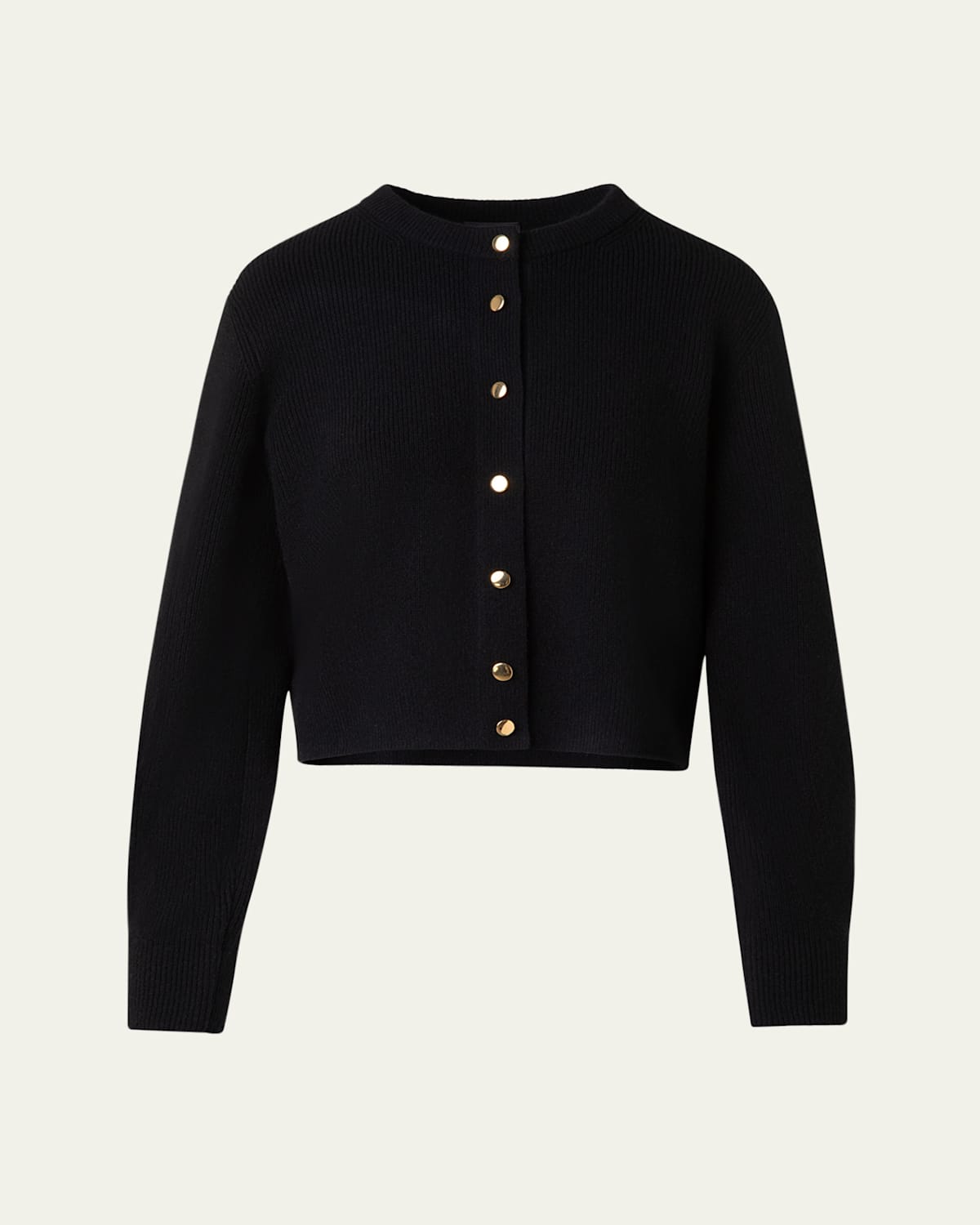Akris ribknit cardigan with goldtone buttons Round neckline Long sleeves Relaxed fit Cashmere Dry clean Made in Romania