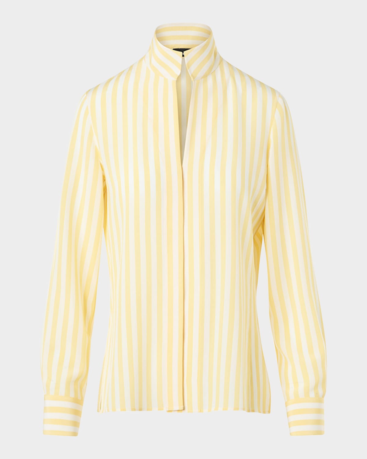 Akris shirt is crafted of silk crepe with a striped print Stand collar; concealed button front Long sleeves; button cuffs Slim fit Side slits hem Silk Dry clean Made in Romania