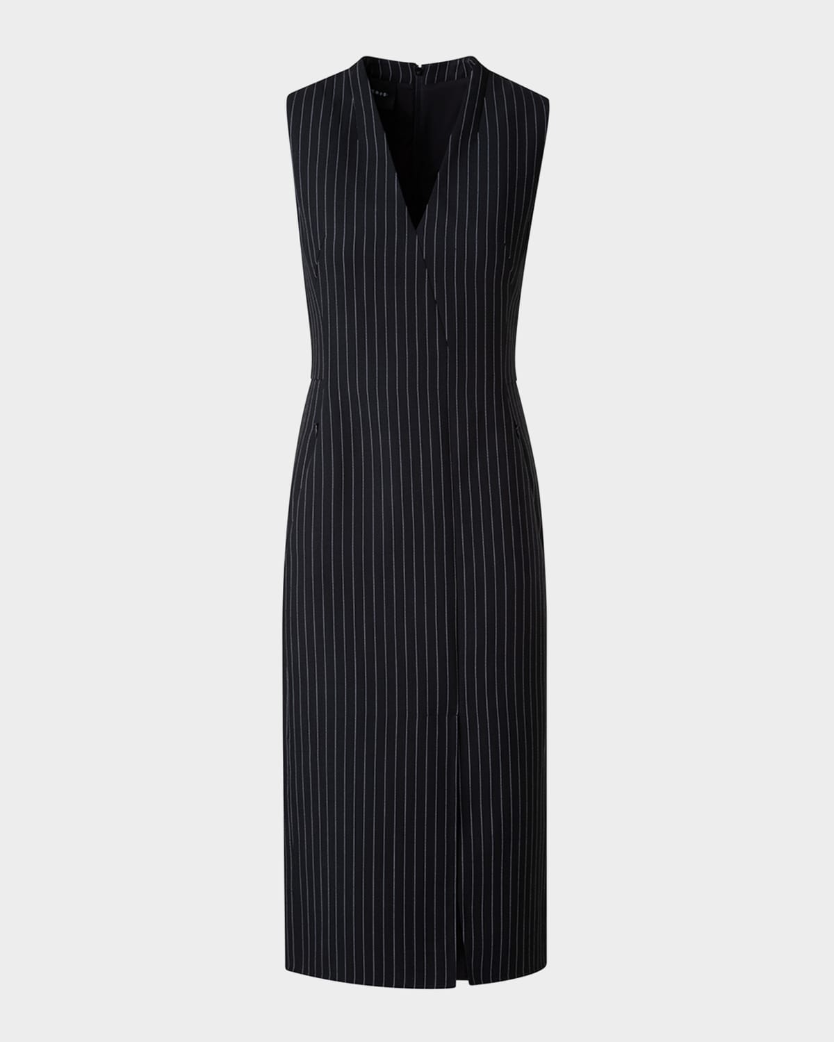 Akris tailored dress featuring a pinstripe motif and a front slit V neckline Sleeveless Sheath silhouette Knee length Invisible back zip Wool Lining: Viscose/silk Dry clean Made in Switzerland