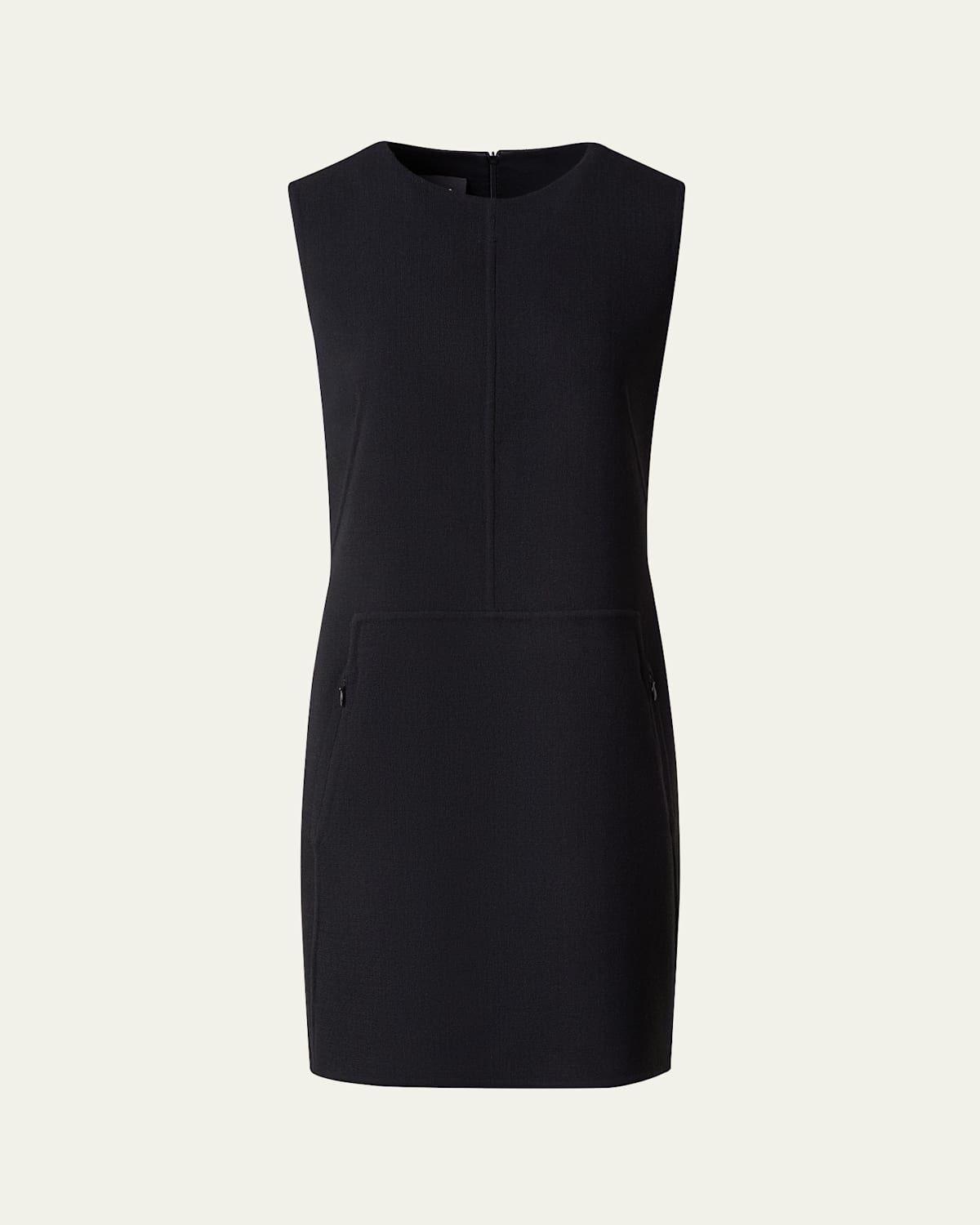 Akris crepe wool mini dress features side zipper pockets Round neckline Sleeveless Hem falls above the knee Aline silhouette Back zip closure Wool/polyester Dry clean Made in Switzerland