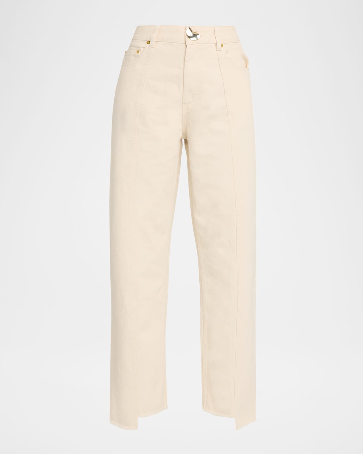 Crafted from 100% undyed organic cotton, the "Sol" jeans by Akyn Studio are finished with an asymmetric frayed hem and distinctive golden kidney button hardware High rise Fivepocket style Full length Straight legs Button/zip fly; belt loops Cotton Made in Portugal