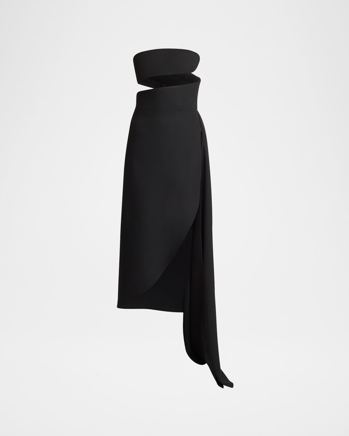 ALAIA 3D spiral dress Strapless neckline Sleeveless Sheath silhouette Midi length High slit Asymmetric hem Silk/wool Made in Italy