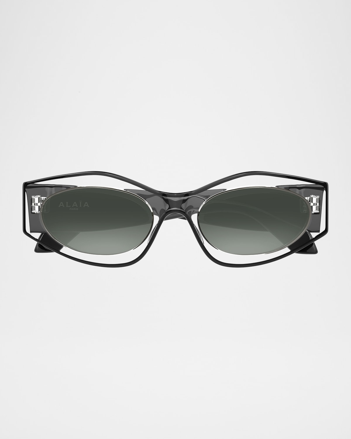 ALAIA cateye sunglasses feature a seethrough frame and a contrast twotone structure Eye/bridge/temple (in mm): 5718140 Monochromatic lenses Saddle nose bridge Logo signature on the temples Wide, tapered arms Acetate 100% UVA/UVB protection Made in Japan