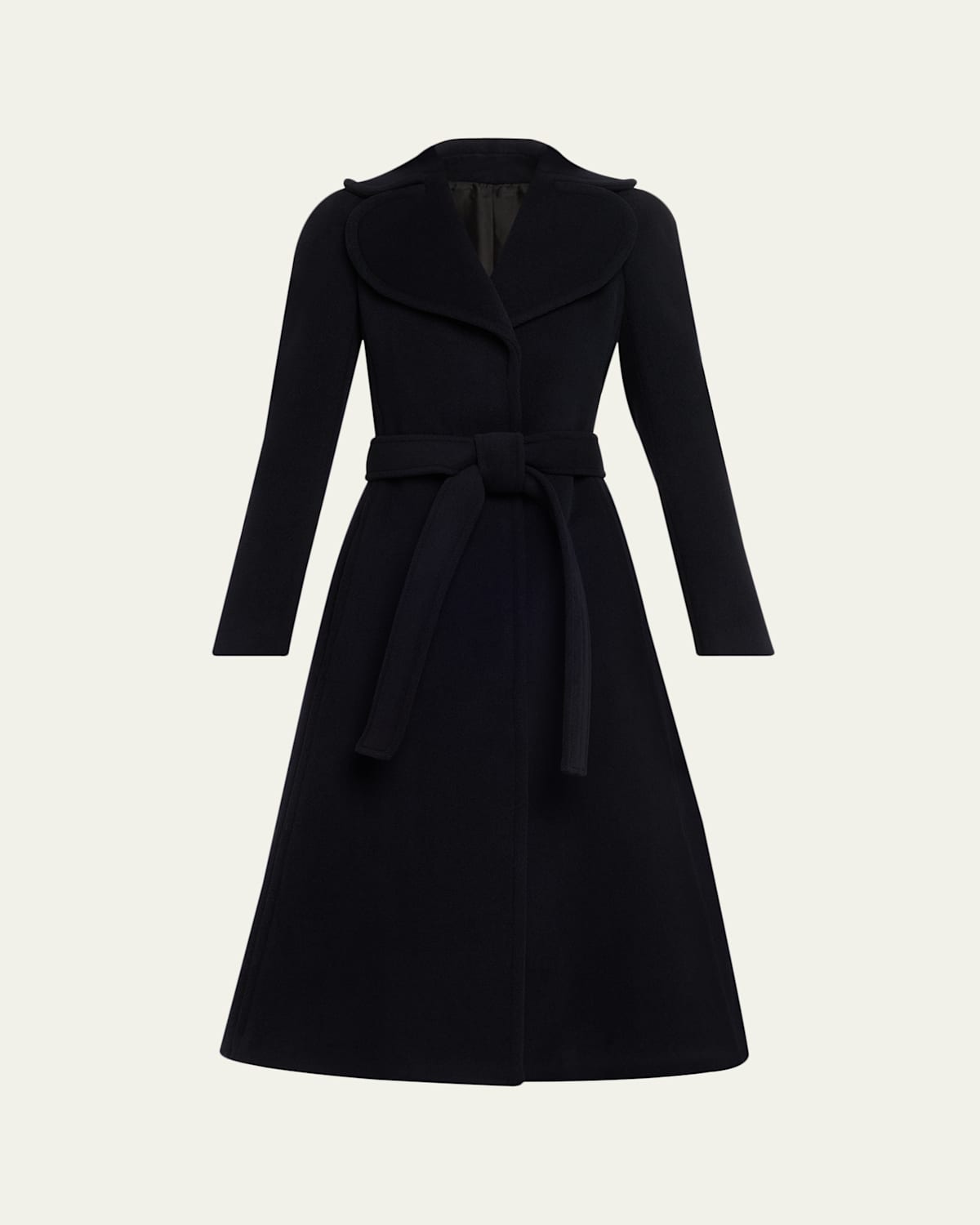 Fitted through the bodice and flared into a full skirt, this cinched coat by ALAIA is crafted from duffle wool Wide curved lapels Long sleeves Side pockets Hem falls below the knee Fitandflare silhouette Selftie belt closure Wool Lining: Cupro Dry clean Made in Italy
