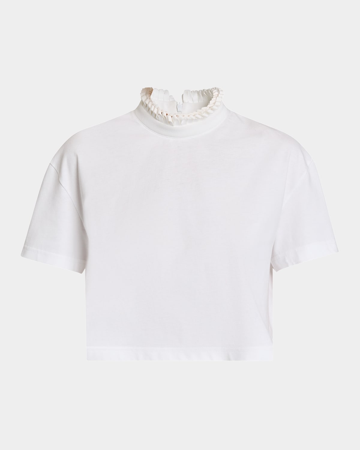 An elevated cotton jersey tshirt, this design by ALAIA features a collared neckline with tonal textural edging and pleated volume High neckline Short sleeves Relaxed fit Cropped hem Invisible back zipper Cotton Hand wash or dry clean Made in Italy