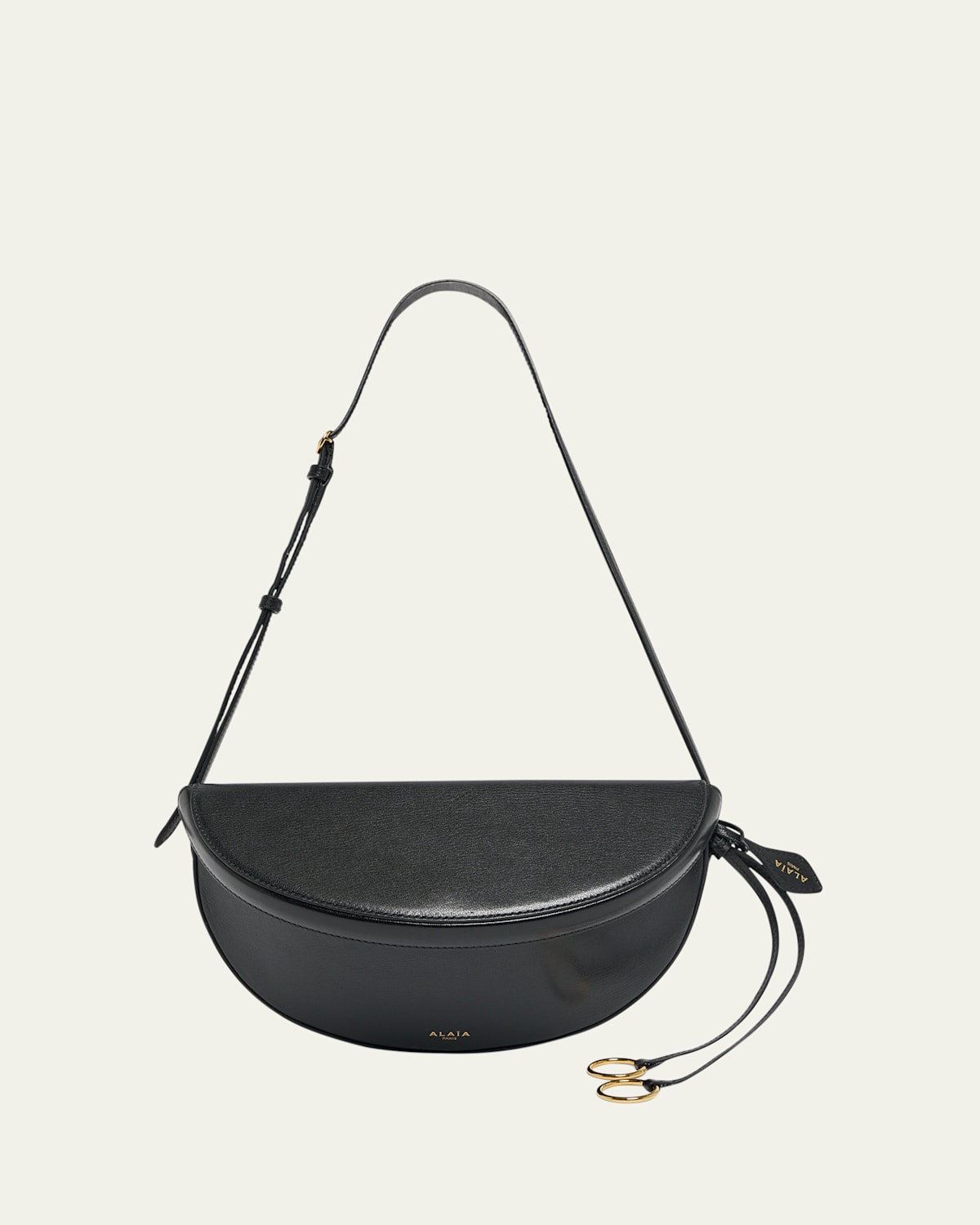 Curved lines define this ALAIA eastwest shoulder bag, crafted in smooth goatskin leather with a natural, subtle grain Adjustable shoulder strap Box flap top with magnetic closure Ring bag charms and logo tag Interior, one card slot Lining: Leather Approx. 6.1"H x 10.6"W x 3.9"D Made in Italy