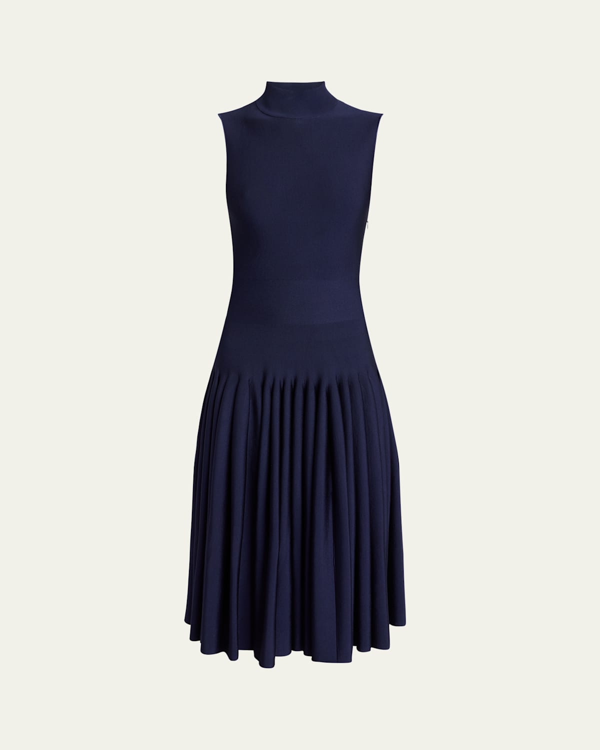 ALAIA knit dress with a pleated skirt High neckline Sleeveless Dropped waist Midi length Fit and flare silhouette Slipover style Viscose/wool/nylon/polyamide Dry clean Made in Italy