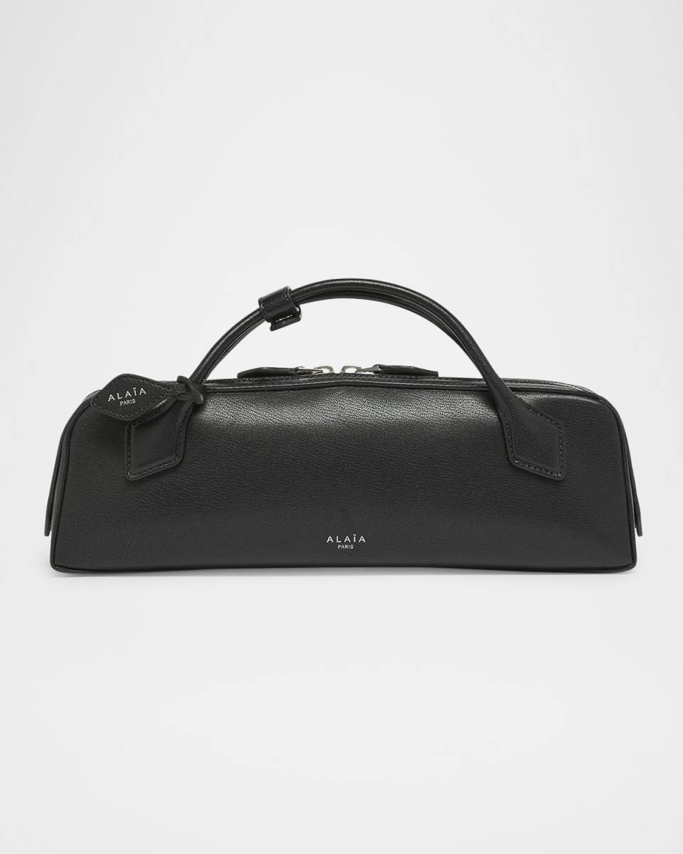 ALAIA "Le Teckel" top handle bag in grained leather Rolled top handles with logo tag Twoway zip top closure Interior, three card slots Lining: Leather Approx. 3.9"H x 12.2"W x 2.8"D Professional cleaning recommended Made in Italy