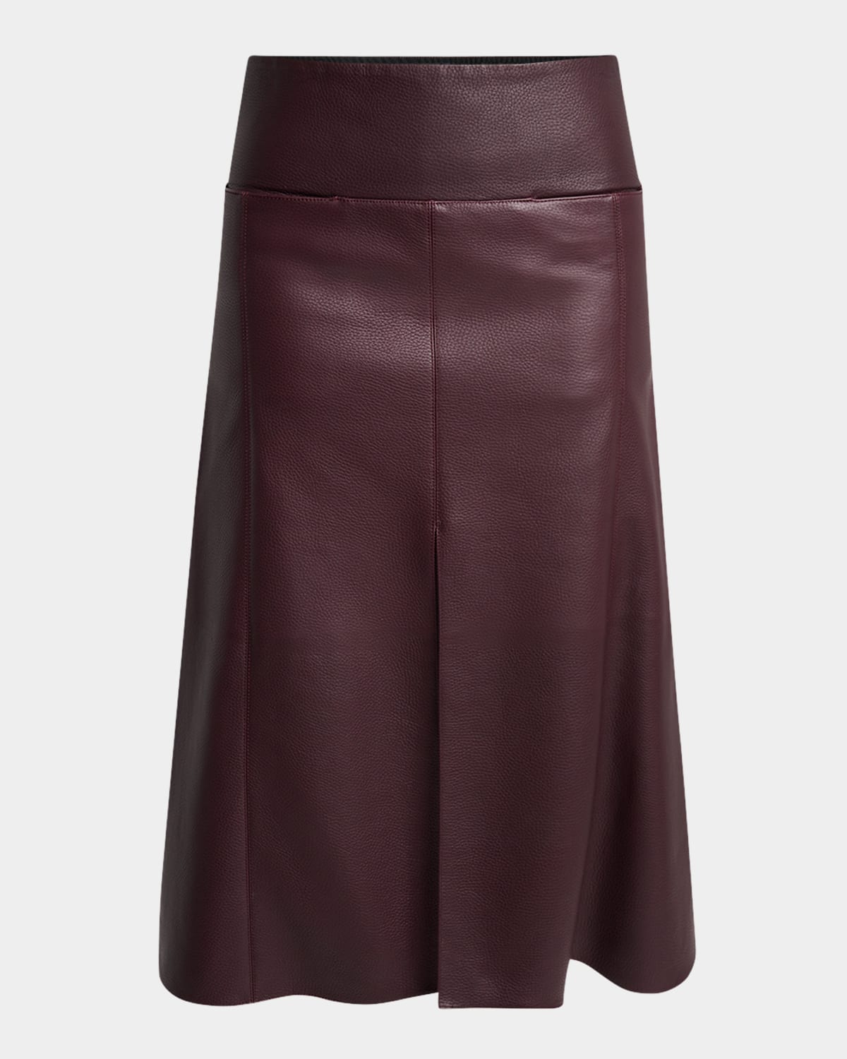 Presented in a paneled construction, this skirt by ALAIA is cut from grained Italian calf leather with a centercut slit for ease of movement Low waist Front seam pockets Hem falls below the knee Aline silhouette Hidden zip closure Leather Lining: Cupro Made in Italy