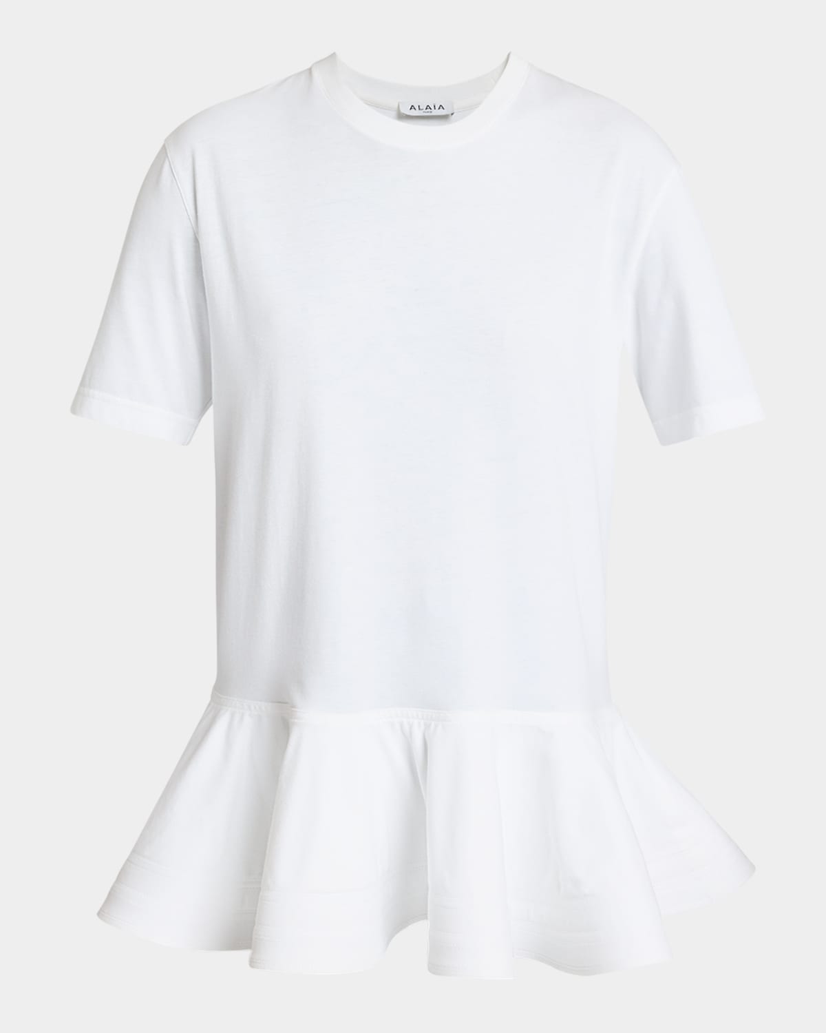 ALAIA cotton tshirt featuring a peplum hem Crew neckline Short sleeves Relaxed fit Hem falls to the hip Pullover style Cotton Dry clean Made in Italy