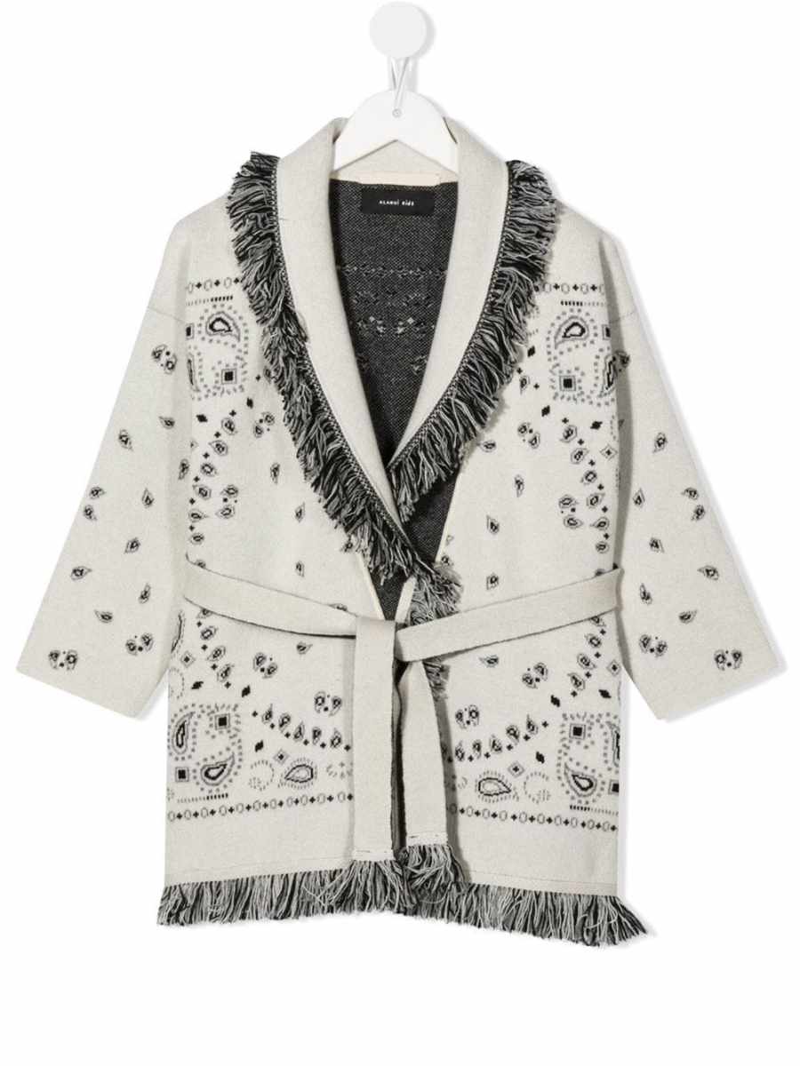 white/black cashmere knitted construction paisley print V-neck tied waist long sleeves fringed edge
