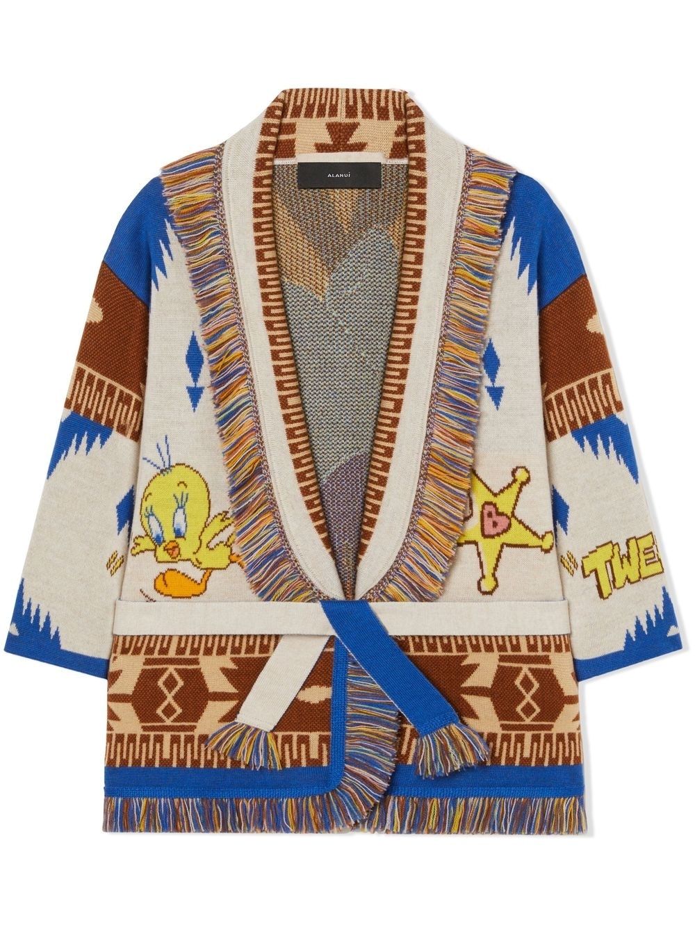brown/multicolour virgin wool shawl lapels belted waist long sleeves fringed edge