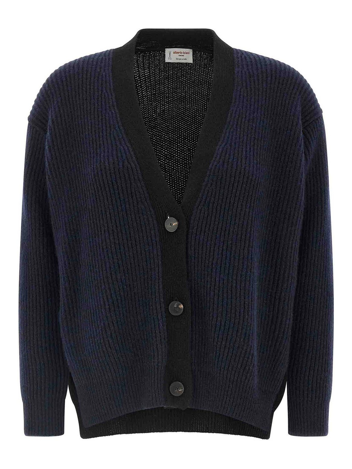 Cardigan bicolore tricoté en V, col, bouton, manches longues à revers, fentes latérales