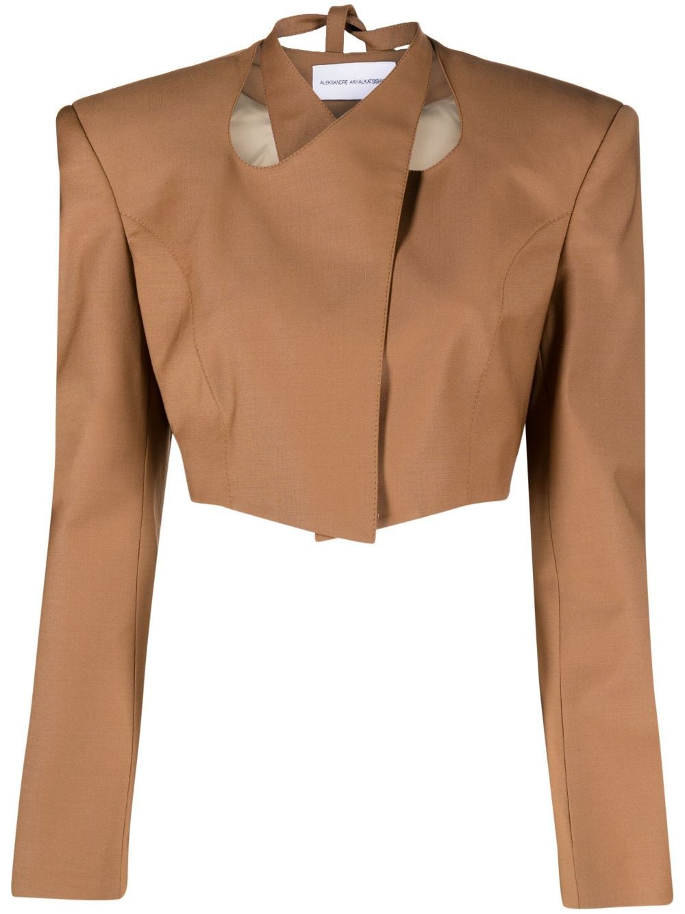 camel brown virgin wool cut-out detailing draped strap detailing shoulder pads long sleeves buttoned cuffs concealed front fastening cropped straight hem