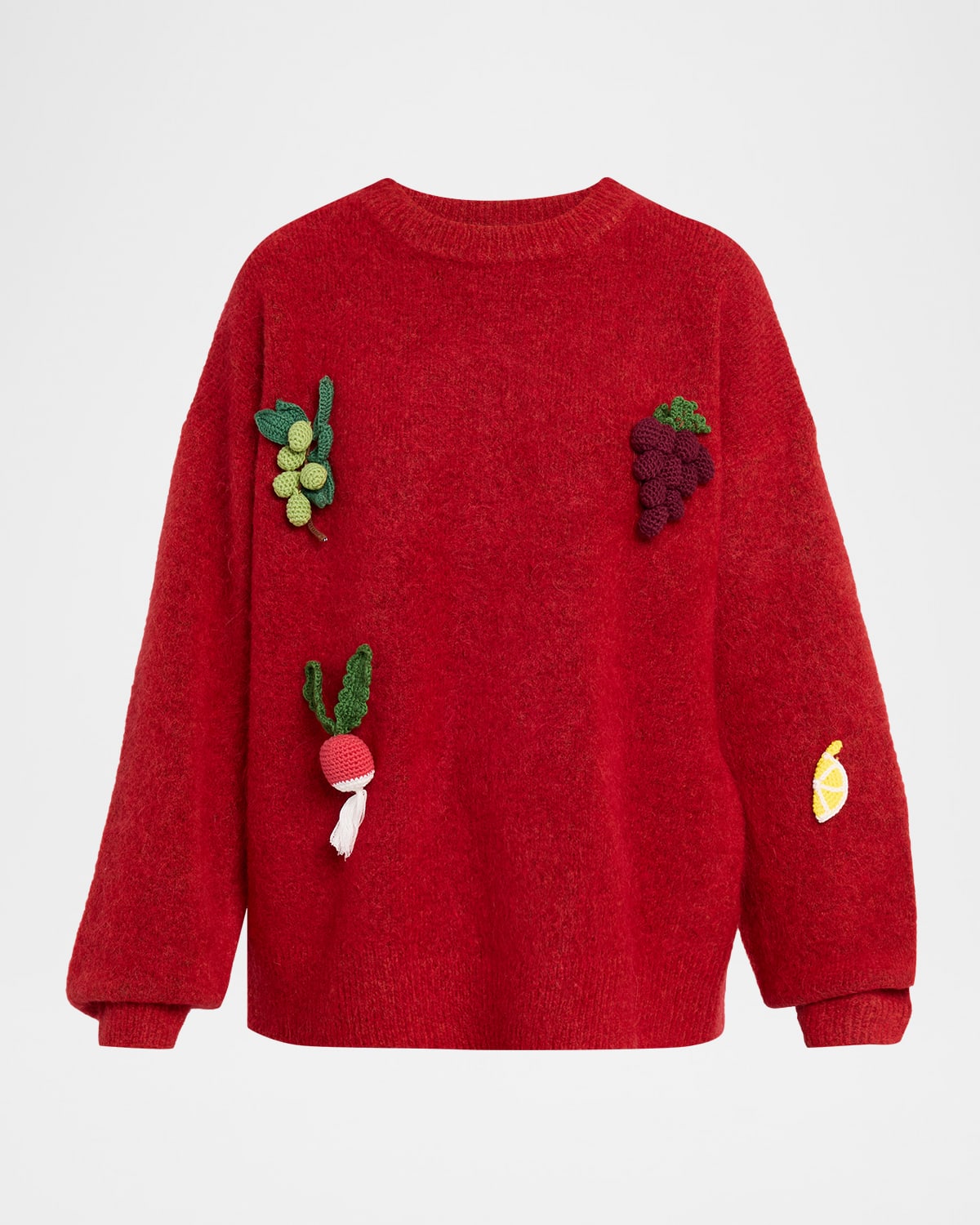 Knit from a fuzzy mohairblend, the "Fruitto" sweater by ALEMAIS is finished with 3D crochet fruit accents Crew neckline Dropped shoulders Long sleeves Relaxed fit Ribbed cuffs and hem Pullover style Wool/Amni® nylon/mohair Imported