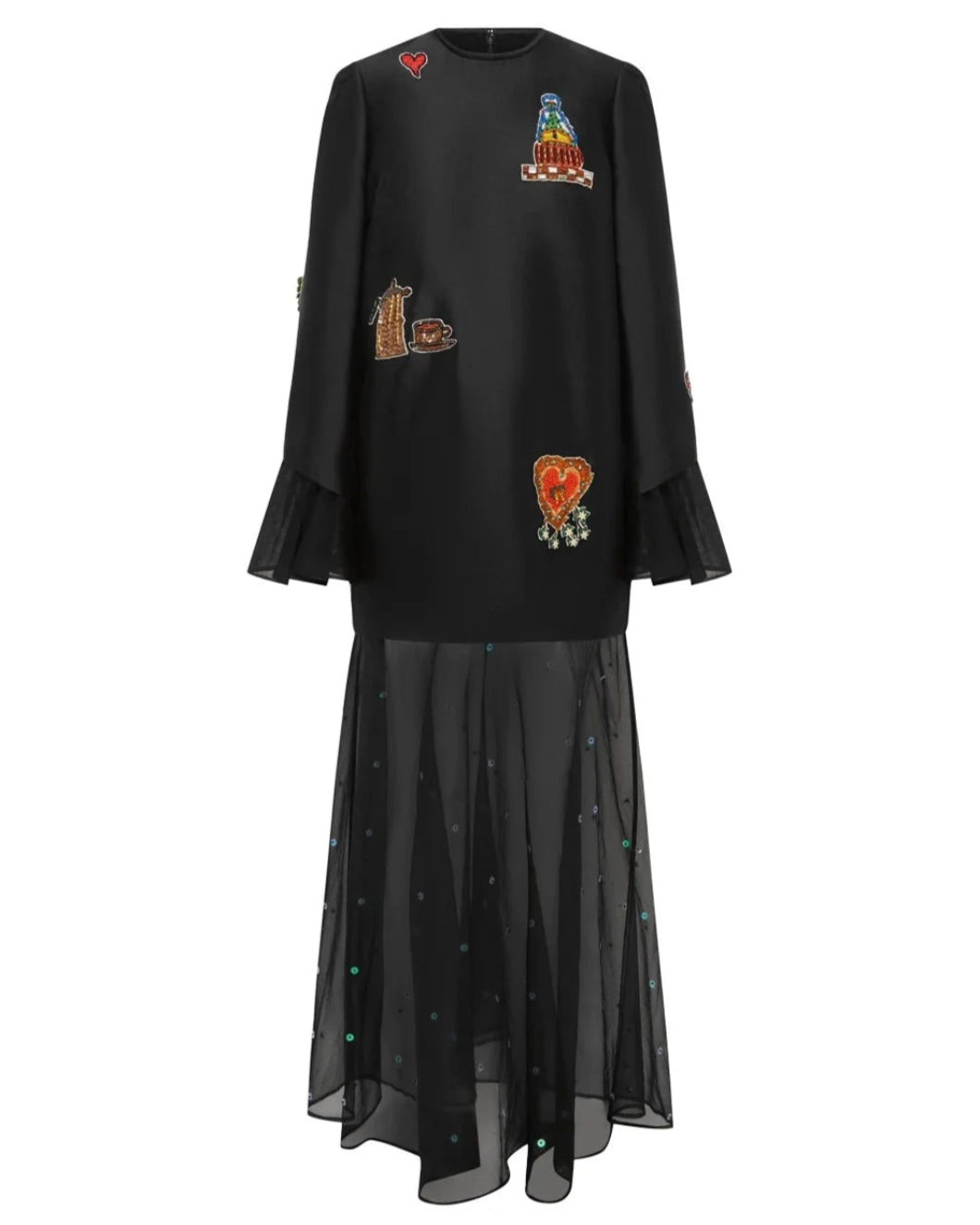 The Ginger Embellished Gown in Cotton Blend in the color Black by Alémais is a mid-length, long sleeve gown that features artisanal beaded motif details, sheer flare skirt with sequin beading, flared sleeves and button/loop closure at the back neck. Your perfect black midi dress with unique detailing. Material: 47% Cotton 40% Polyester 13% Silk Details: Round neck. Sizing: Model height is 5'9in/175cm, Bust: 85cm/33.5in, Waist: 64cm/25in, Hip: 88cm/34.5in, and wears a size US4 (AU8) Fit: True to size. Relaxed fit. Style it with: A colorful heel and fun handbag. Care: Delicate dry clean only. #5823D