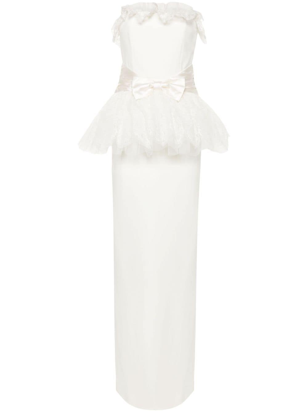 white cady texture duchesse lace detailing detachable waist belt with peplum detail rear zip fastening bustier-style neckline rear slit column silhouette satin lining straight hem long length