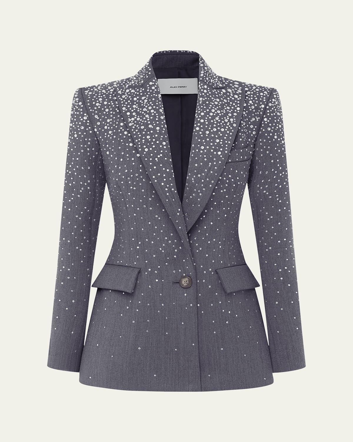 Alex Perry blazer jacket embellished with degrade crystal strass Peak lapels; singlebreasted front Long sleeves; button cuffs Chest welt pockets Hip flap pockets Fitted Hem falls below the hip Button closure Polyester/wool Lining: Viscose Dry clean Made in Australia