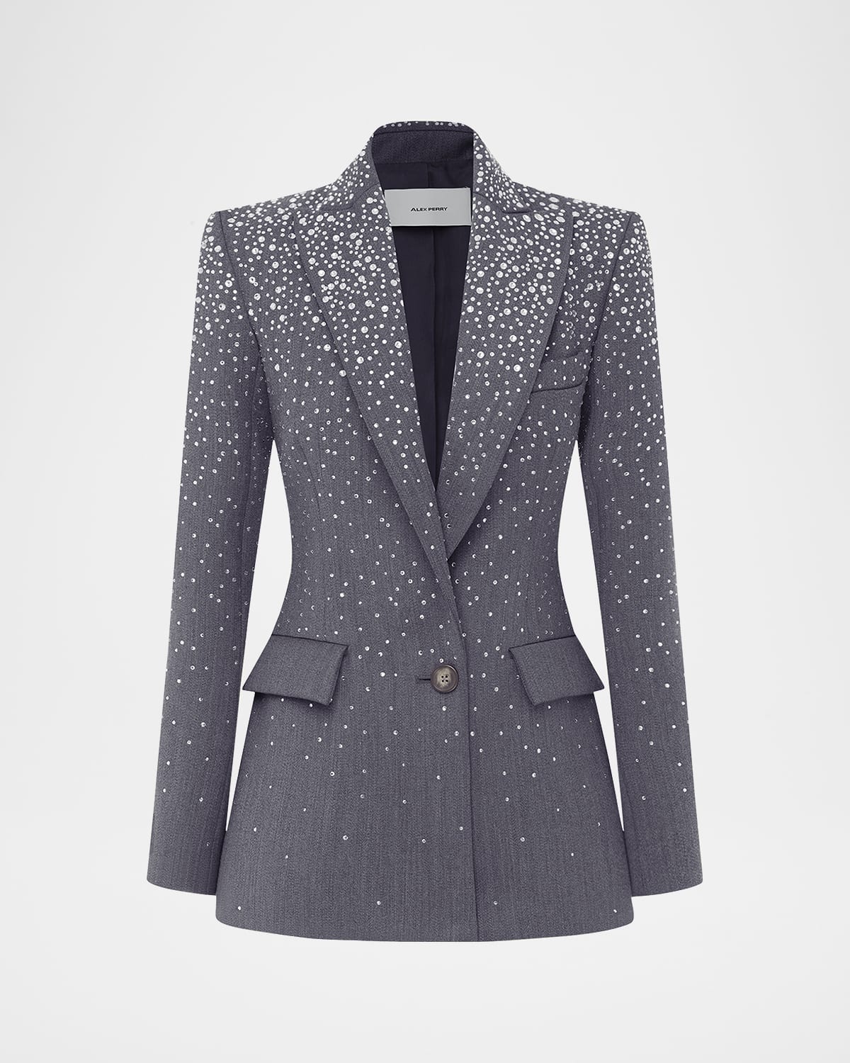 Alex Perry blazer jacket embellished with degrade crystal strass Peak lapels; singlebreasted front Long sleeves; button cuffs Chest welt pockets Hip flap pockets Fitted Hem falls below the hip Button closure Polyester/wool Lining: Viscose Dry clean Made in Australia